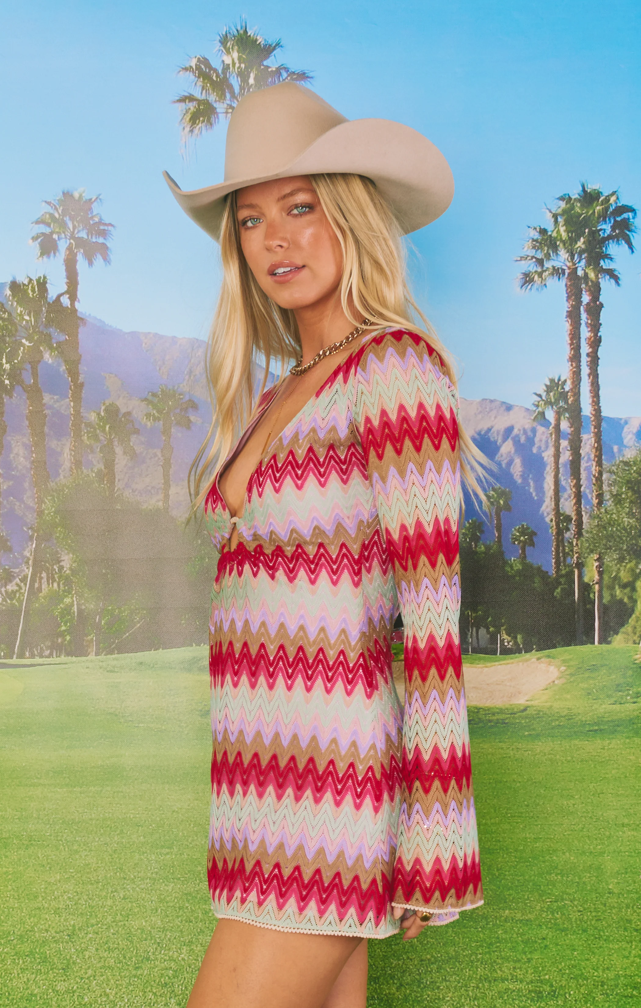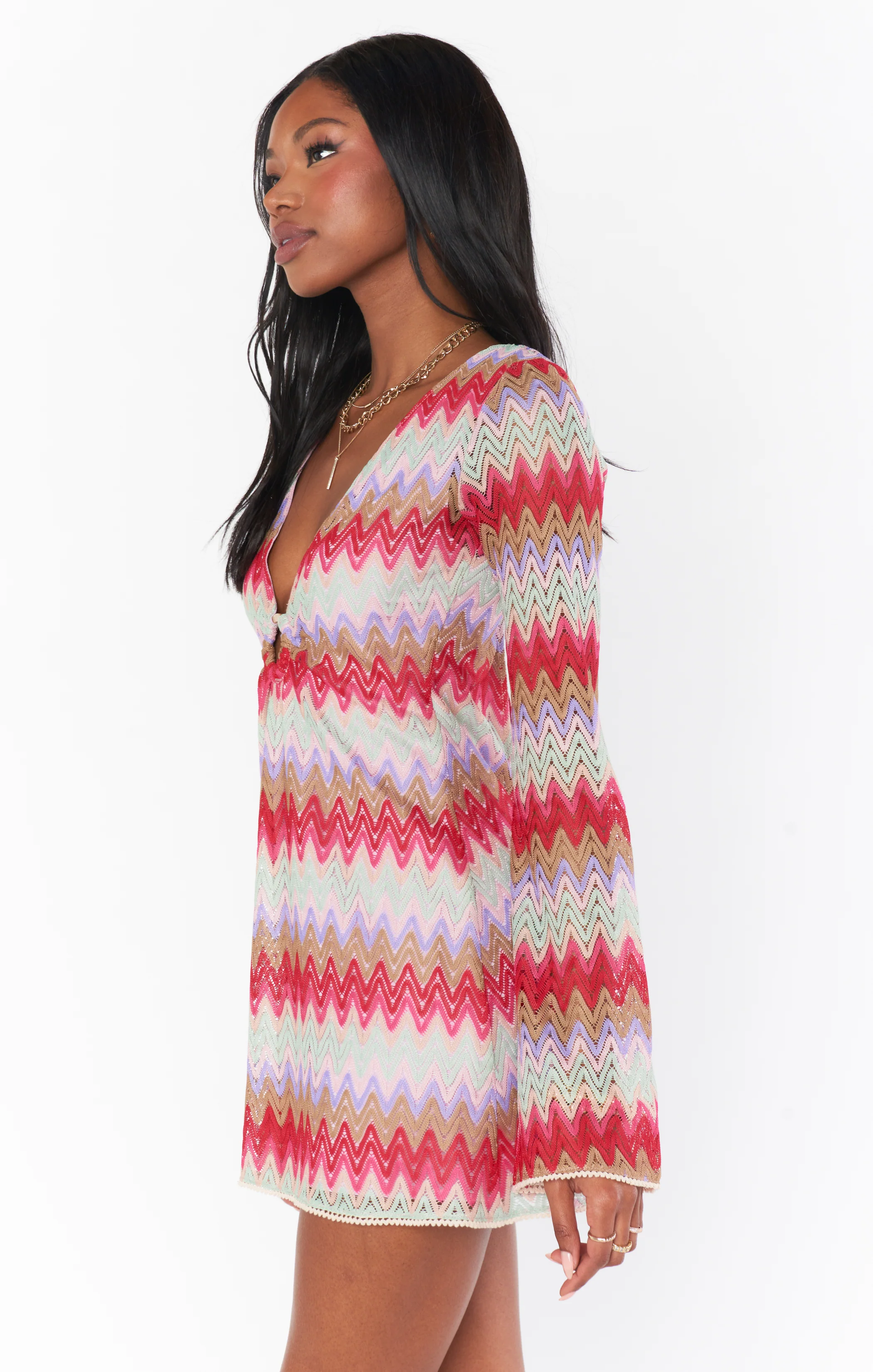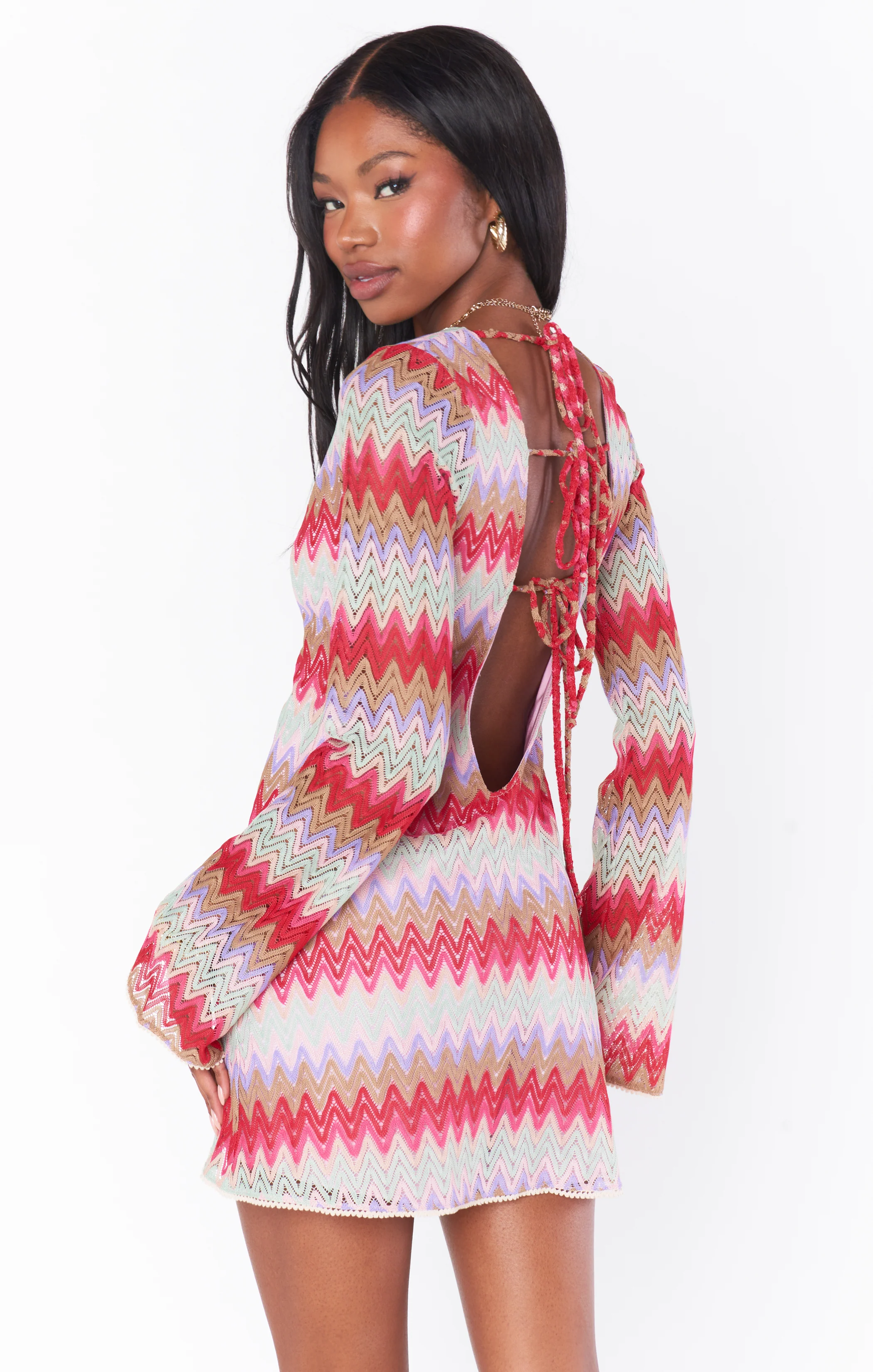 A whimsical romper with a zigzag pattern, o-ring front, bell sleeves, and a scoop back. Perfect for adding a touch of flirty fun to your party outfits. Designed to look like a micro mini but wear like a full-length romper. The perfect vacation look with strappy sandals or festival-ready with cowboy booties.