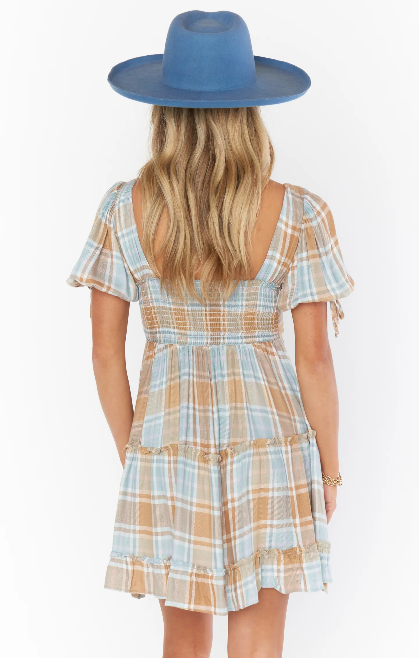 A light blue and tan plaid dress with a sweetheart neckline, puff sleeves, and ruffled hem. Bow ties at the cuff only sweeten the deal! This dress can be worn alone or under a thick cardi with cowboy boots for the perfect transitional look.