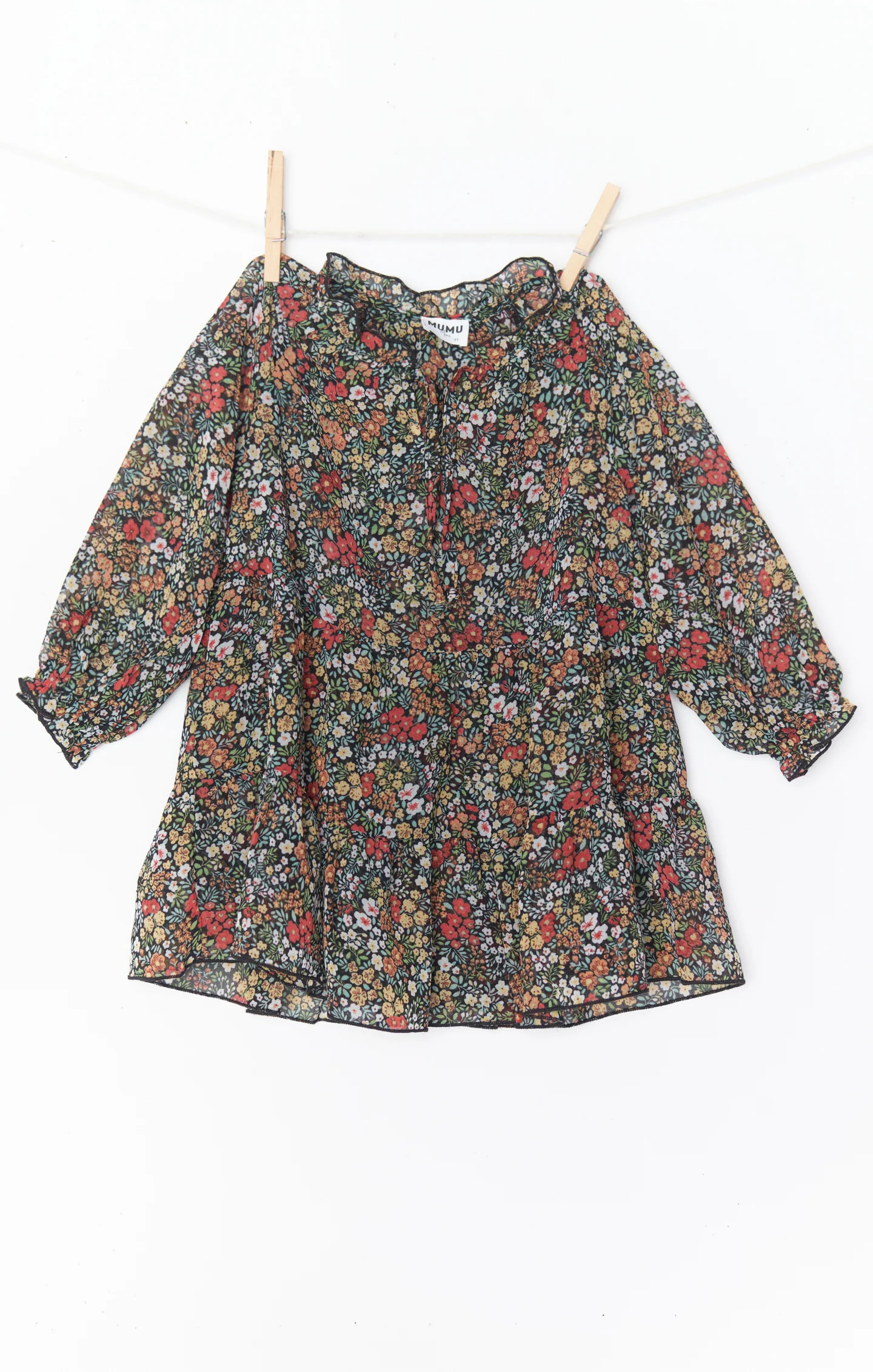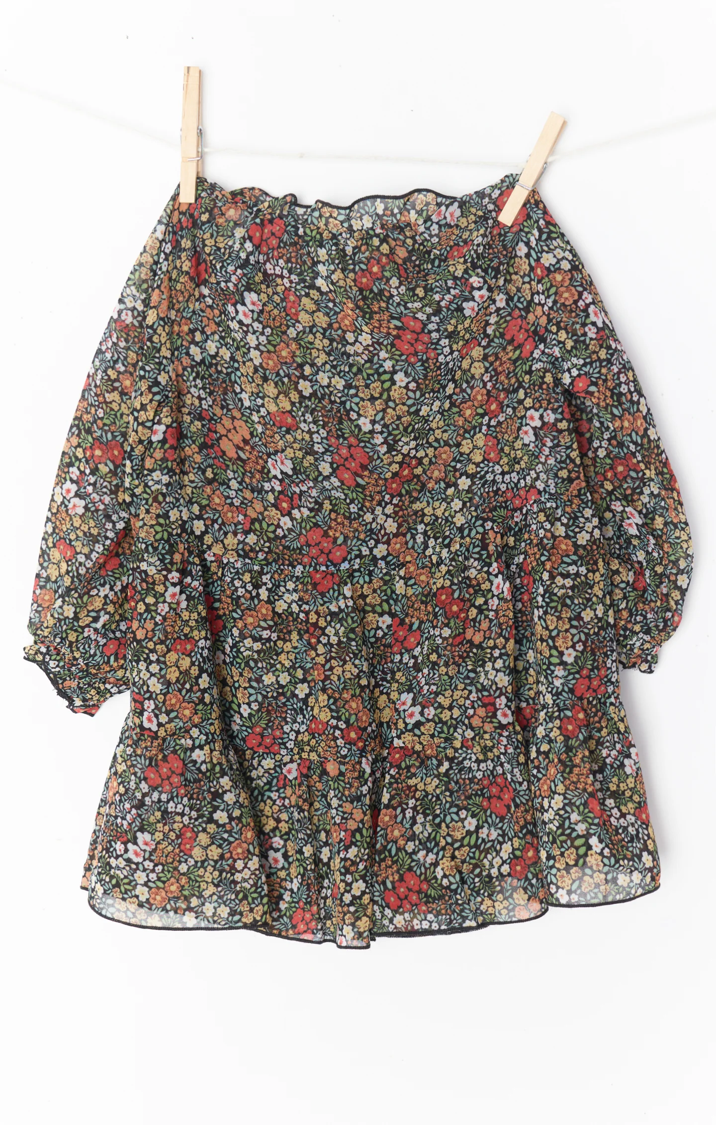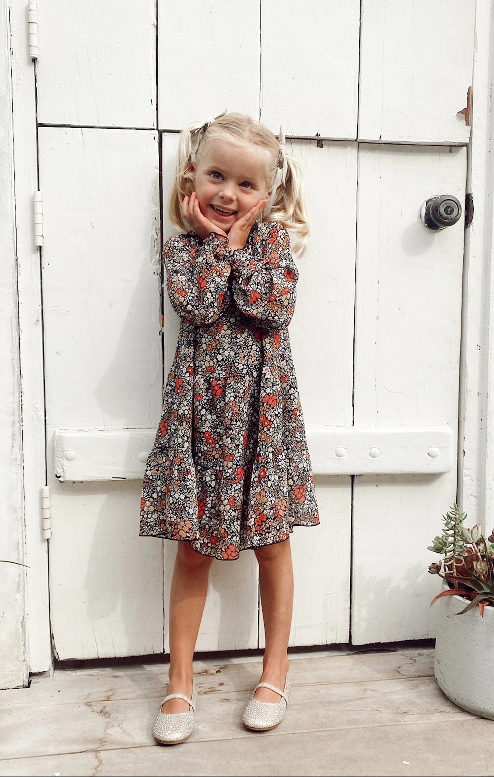 DetailA flowy black floral dress with long poof sleeves and a tiered skirt, perfect for fall. Match your mini with the Black Floral Birdie Mini Dress.