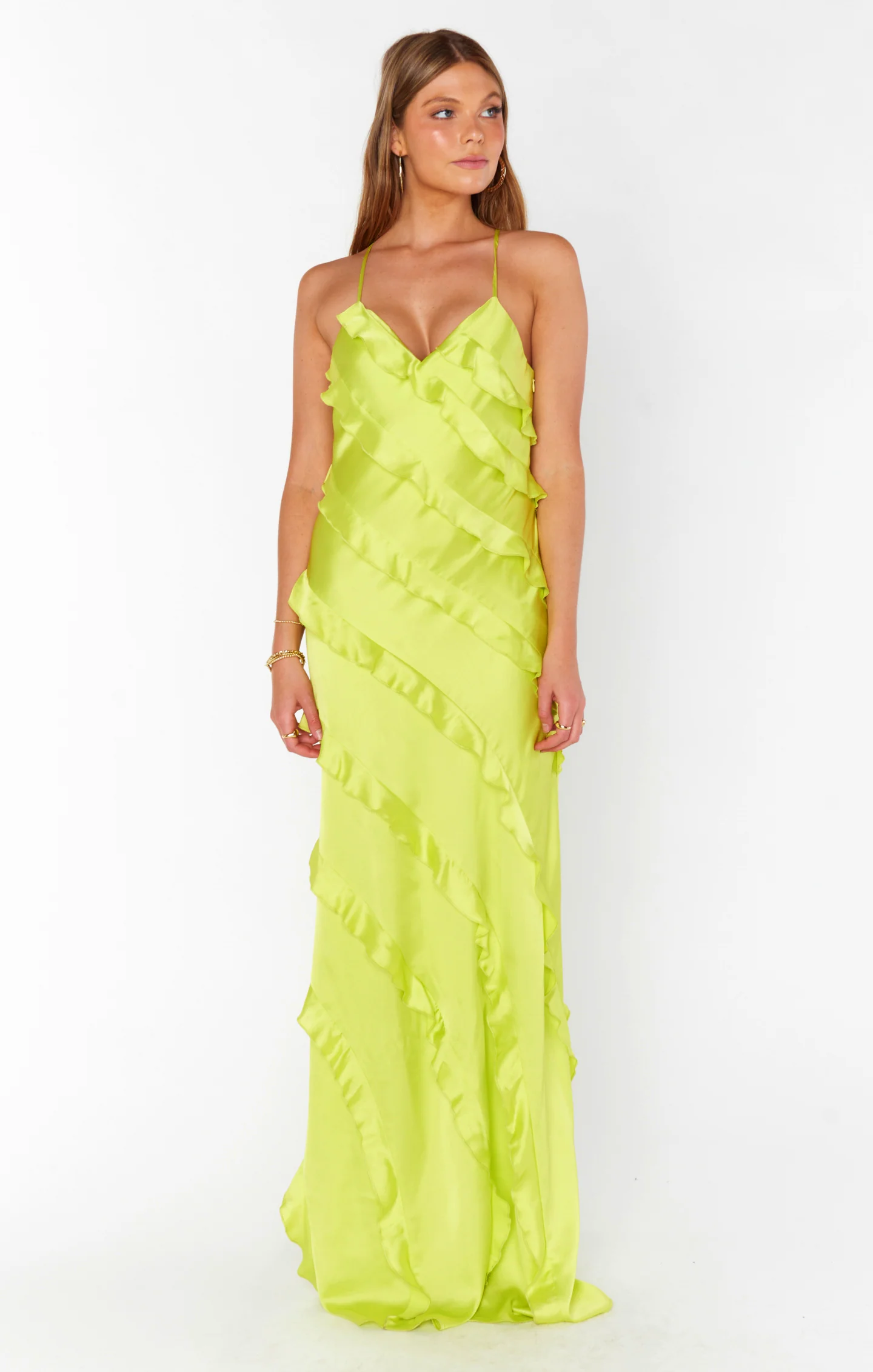 DetailA floor-length slip dress with a ruffle detailing that adds a touch of flirty fun. It's ideal for formal occasions, offering both elegance and a romantic feel.