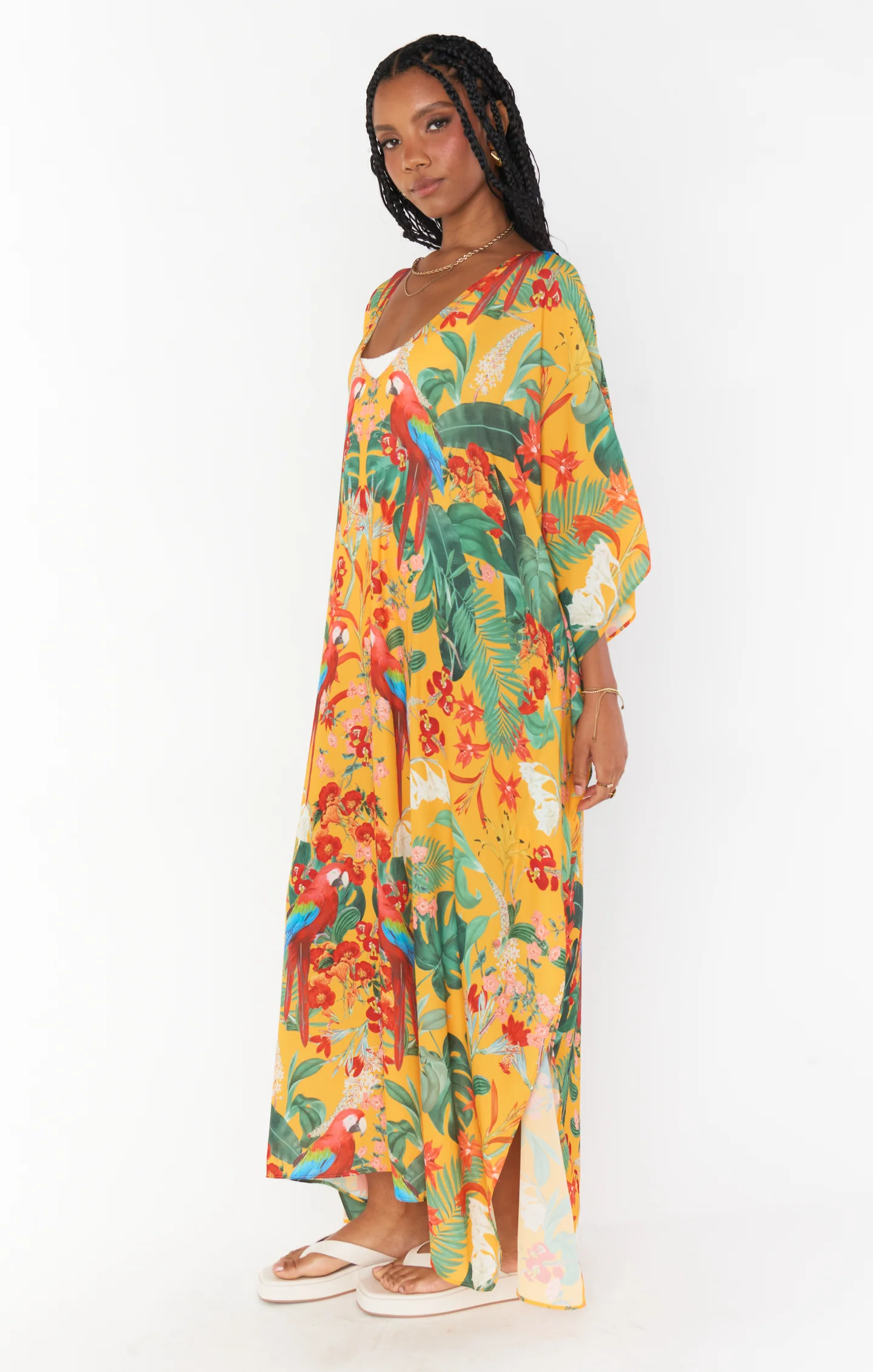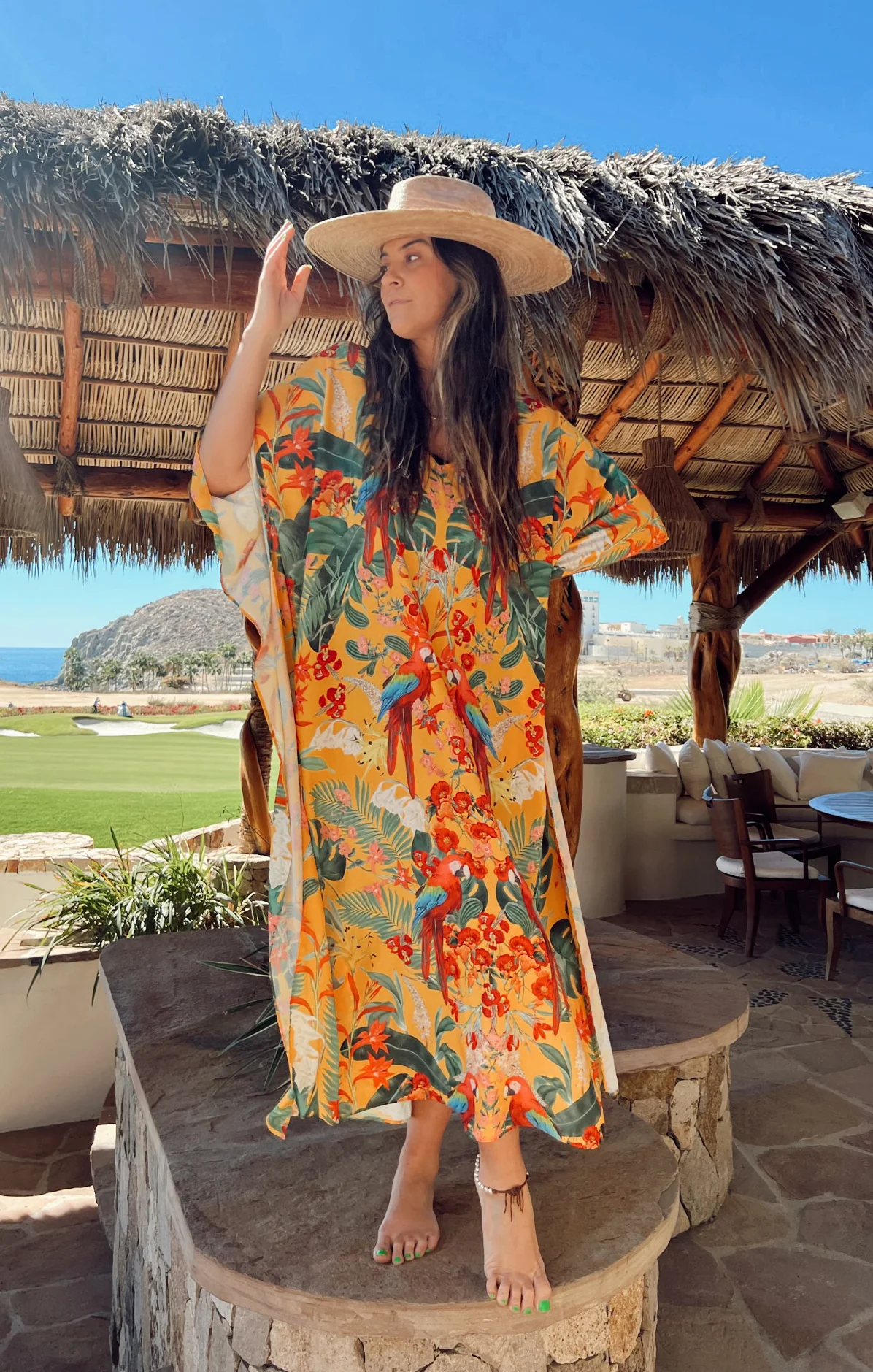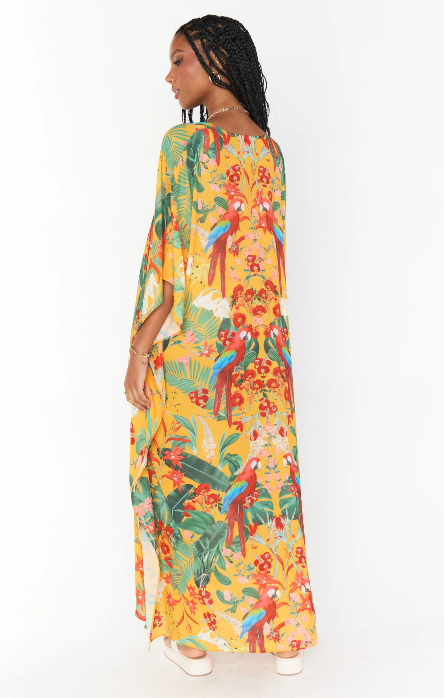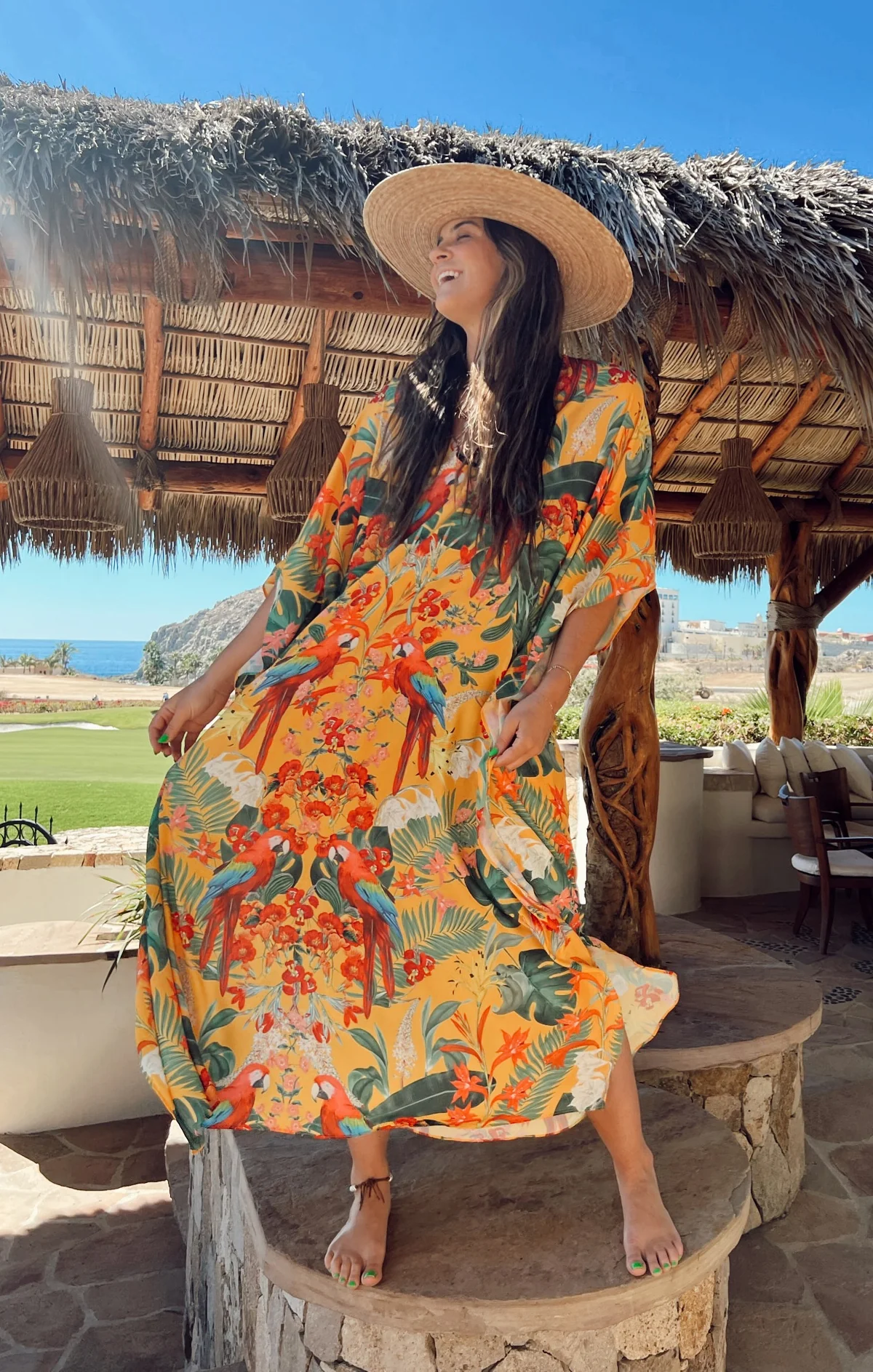 A regal, oversized tropical floral maxi with a flowing kaftan body that complements the wearer's style. The product is suitable for both swim coverups and other outfits like slip dresses or tight tops with denim shorts. Perfectly designed to elevate your style in any tropical setting.