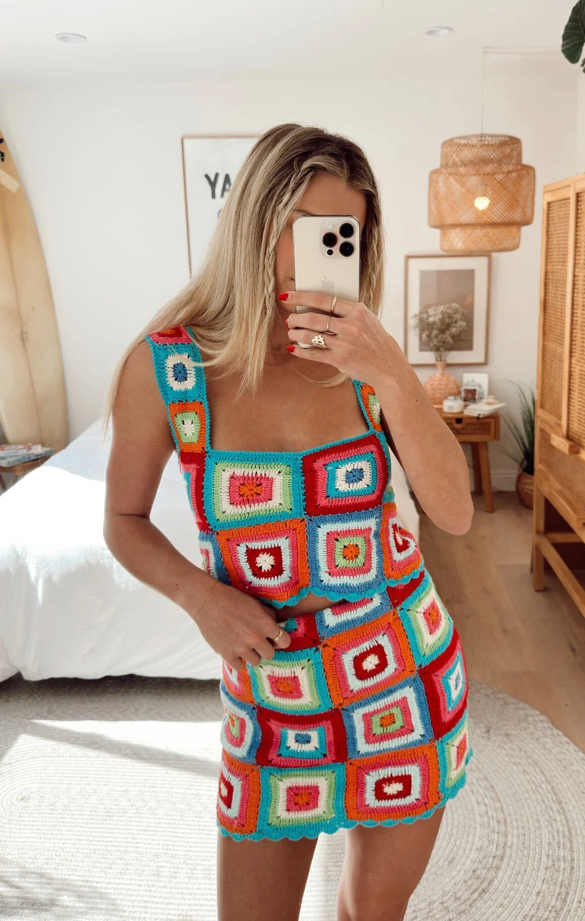 DetailA cute, rainbow micro mini skirt with an elastic waistband for a comfortable fit. The crochet detailing adds a unique touch and is perfect for beach days or retro looks.