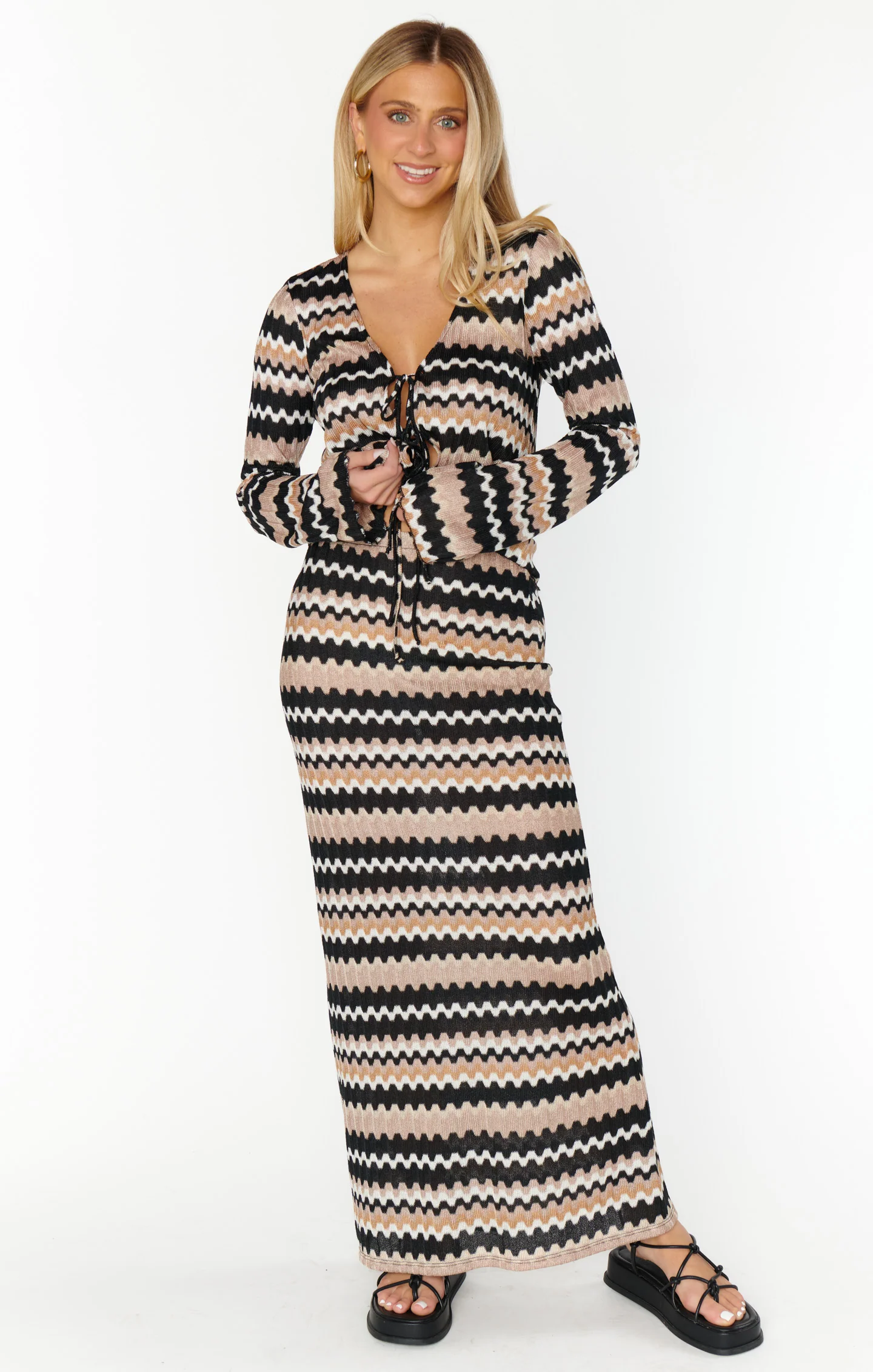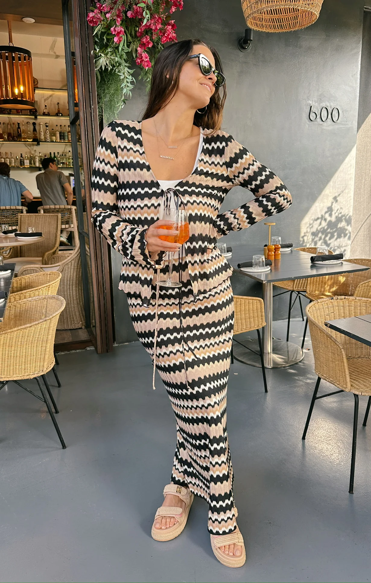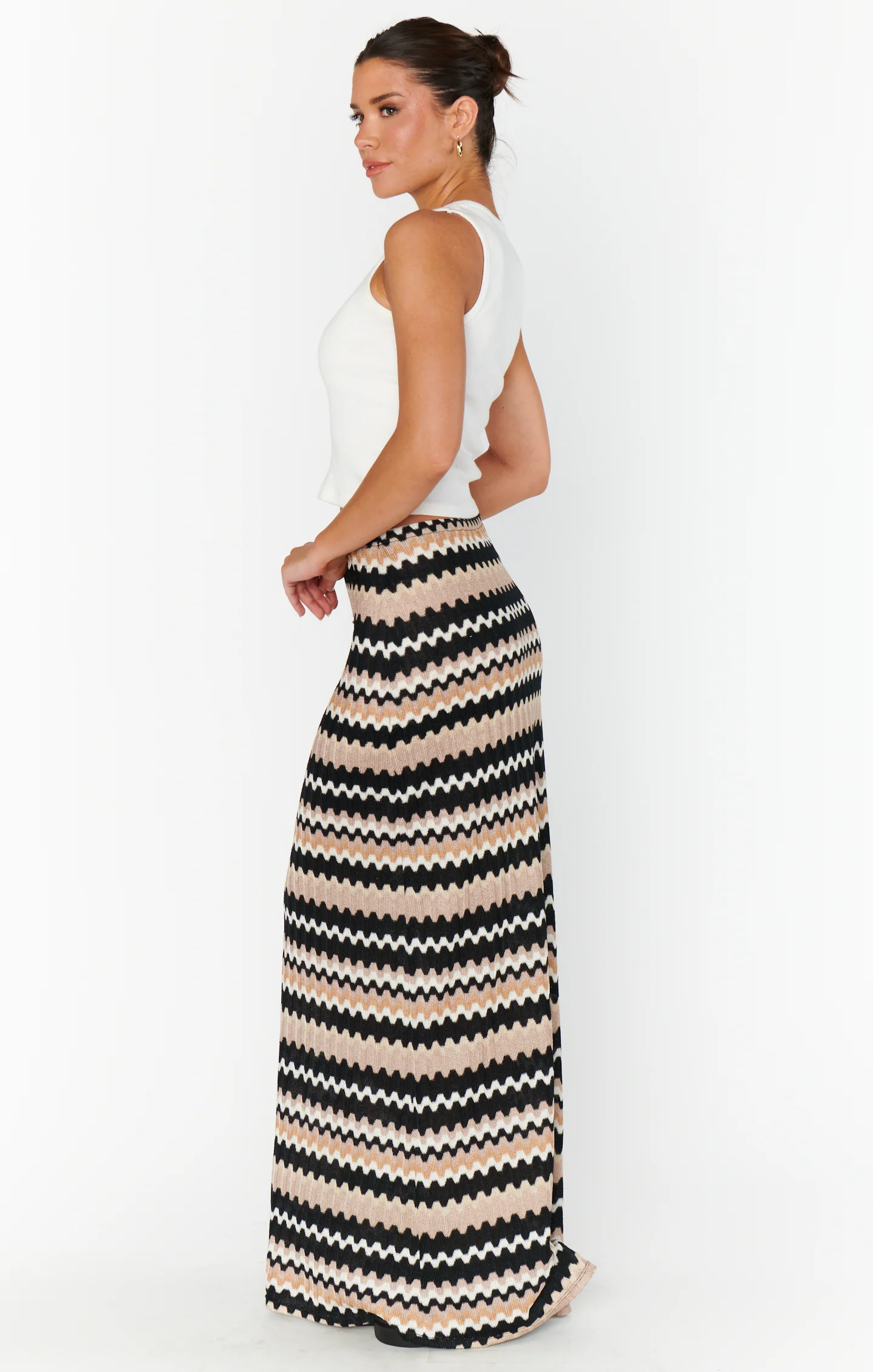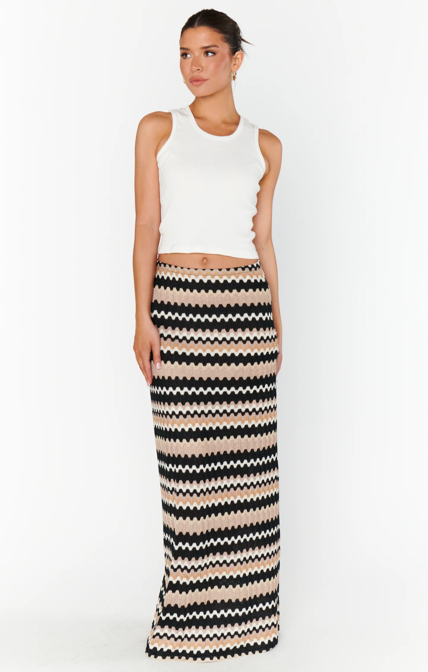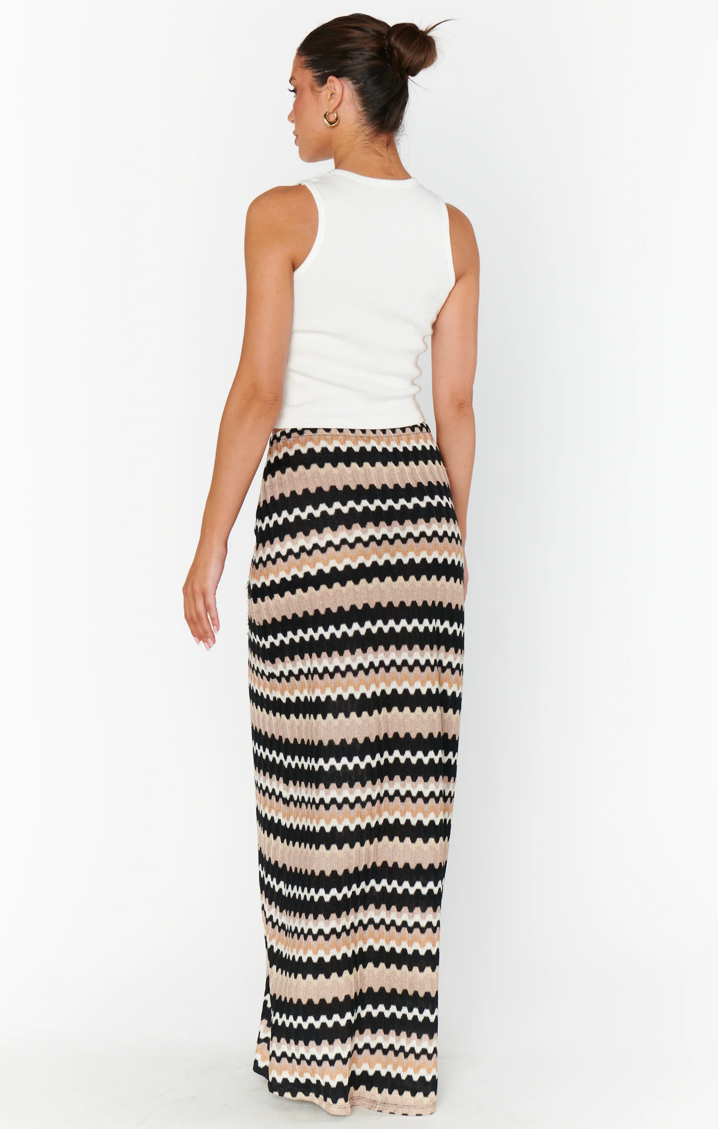 A neutral, groovy maxi skirt that adds a playful touch to your beach look, perfect for covering up your mumu swimmies.