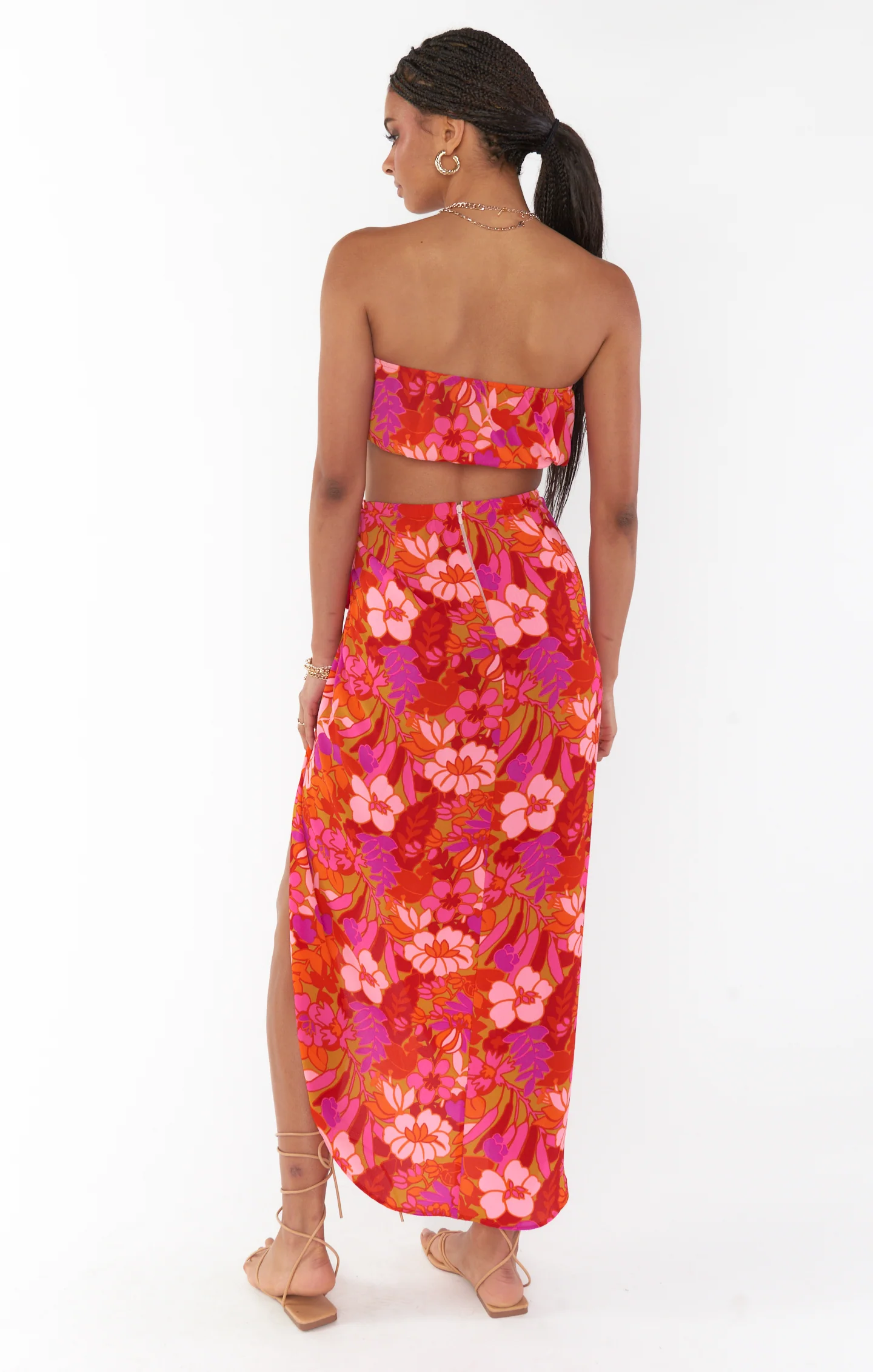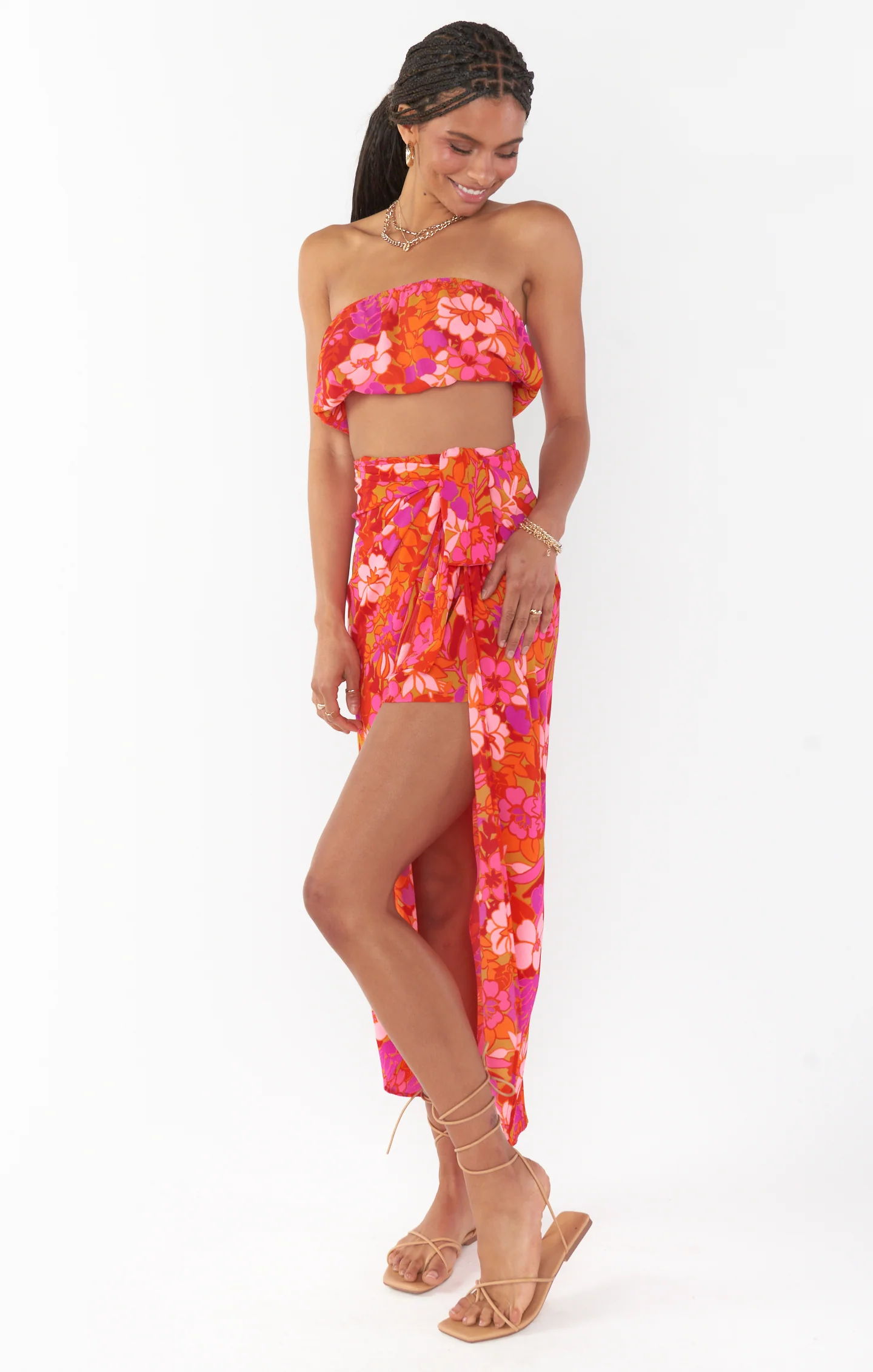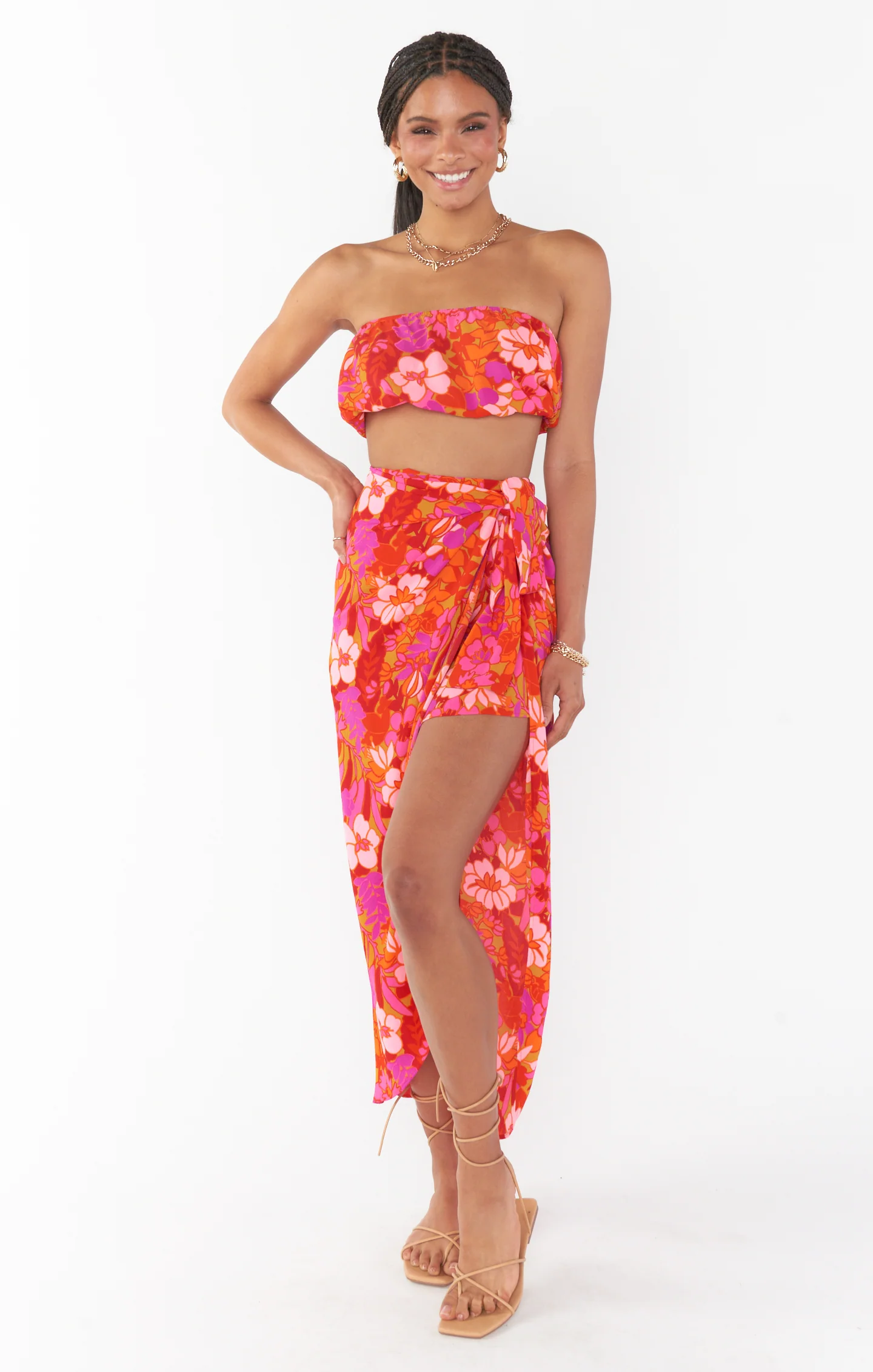 A cute and stylish floral wrap skirt with a mini slip and high-to-low outer layer, perfect for casual outings. It features a natural look while staying trendy and elegant. The matching Teeny Tube Top and strappy sandals complete the outfit experience.