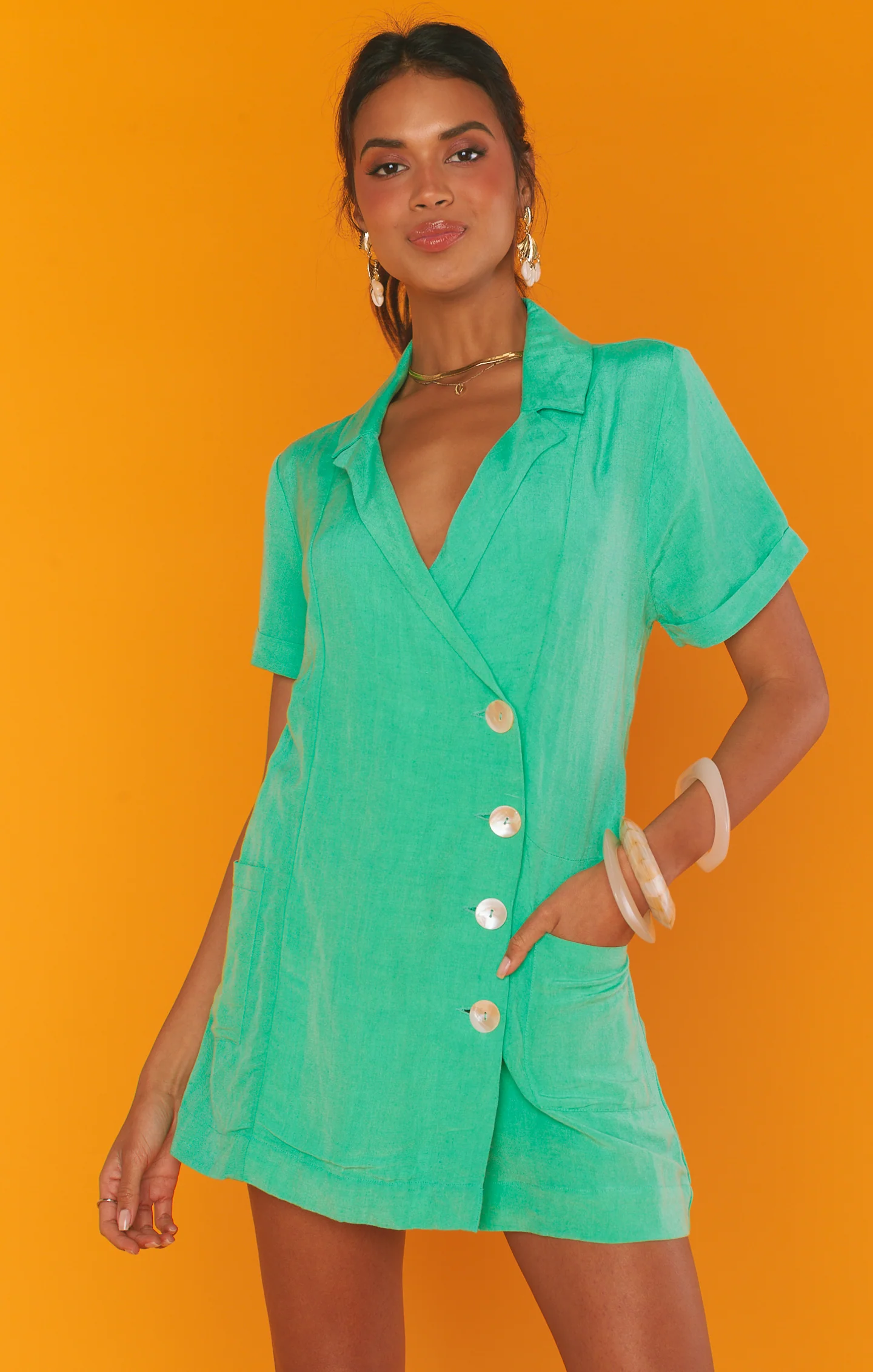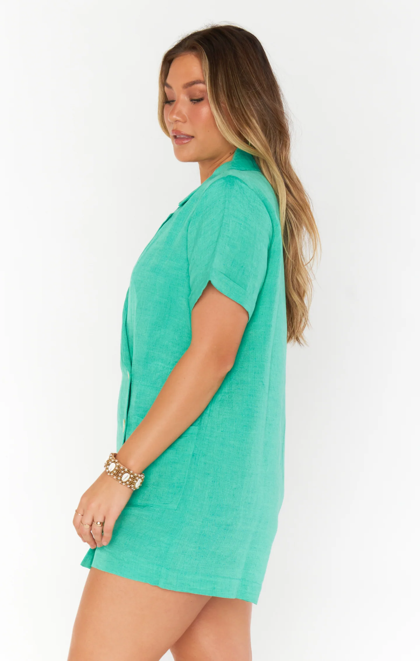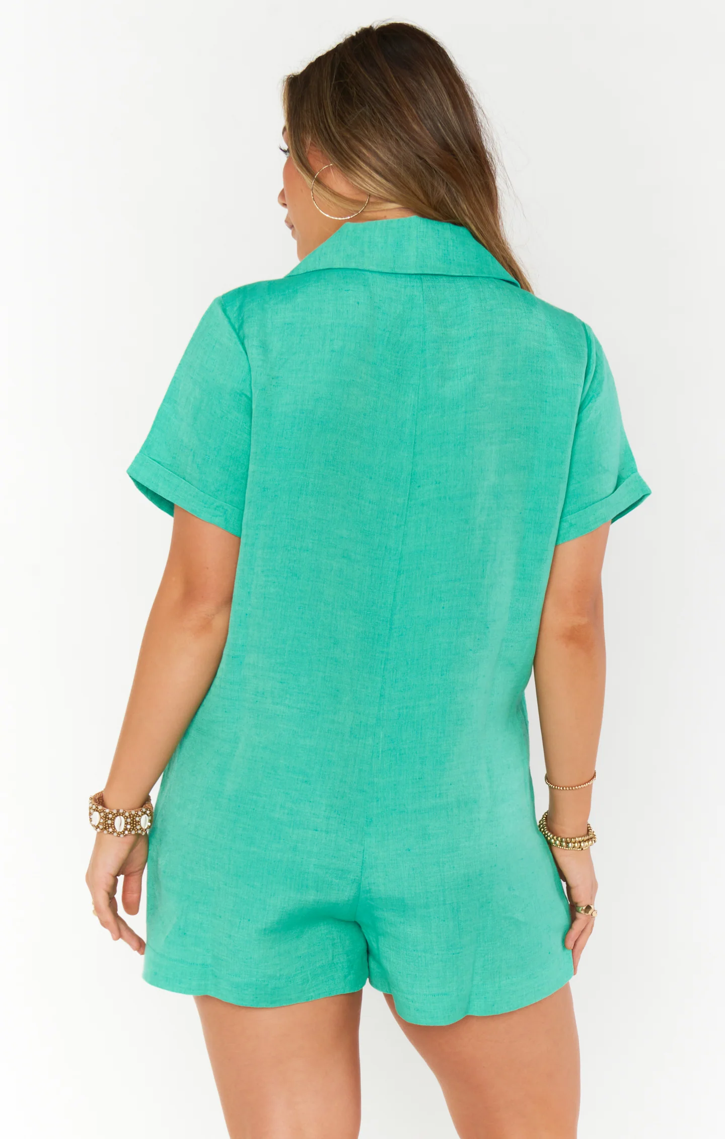 A chic, casual blazer romper made from crisp seafoam linen with white contrast buttons and side pockets. Style with white platform sneakers for a casual feel or dressed up with heels and dainty jewelry.