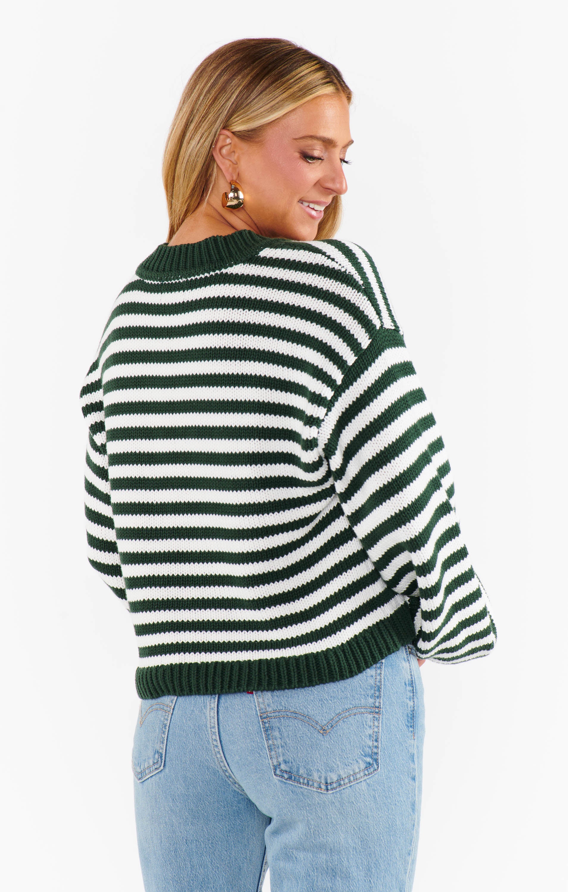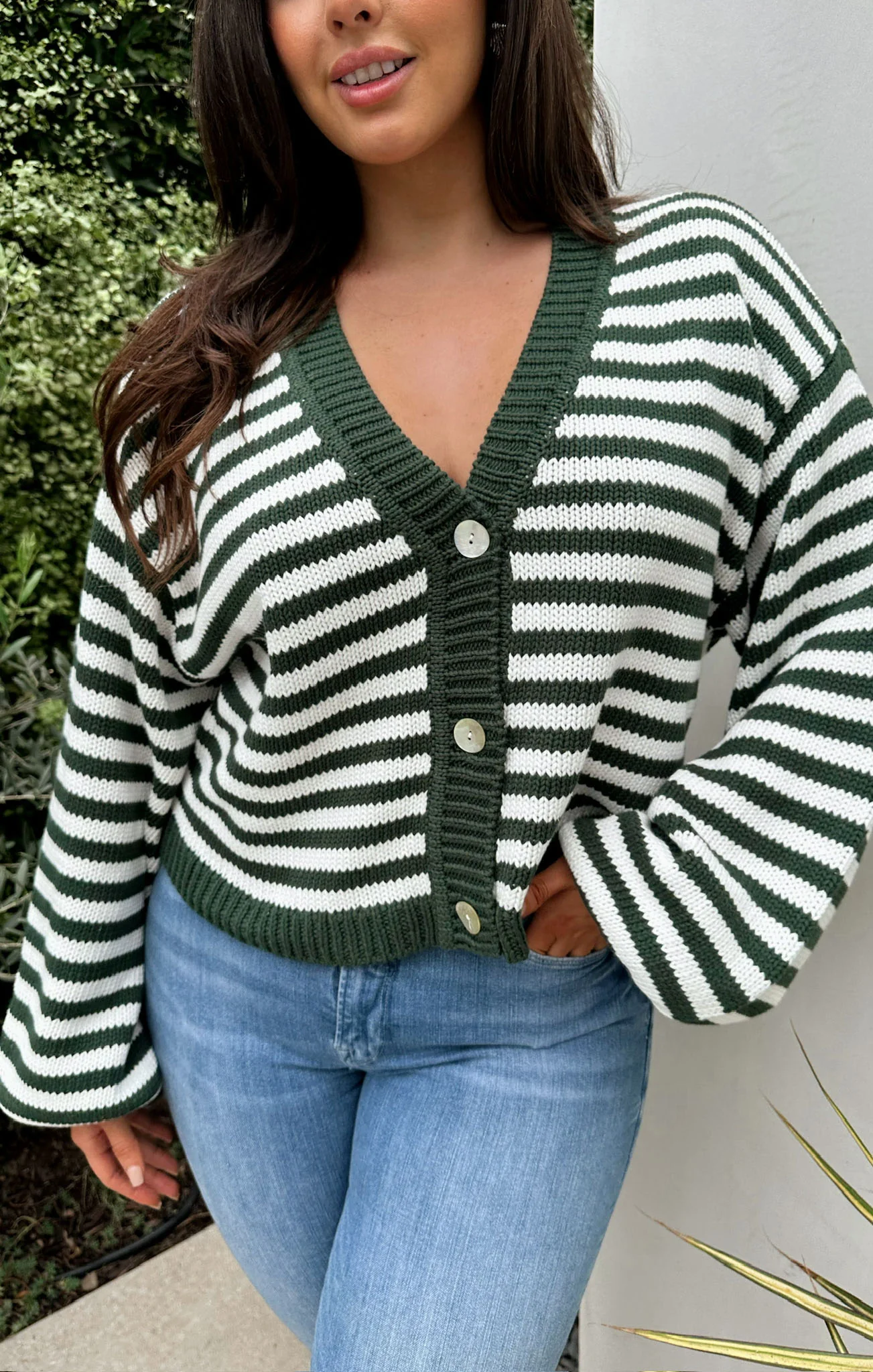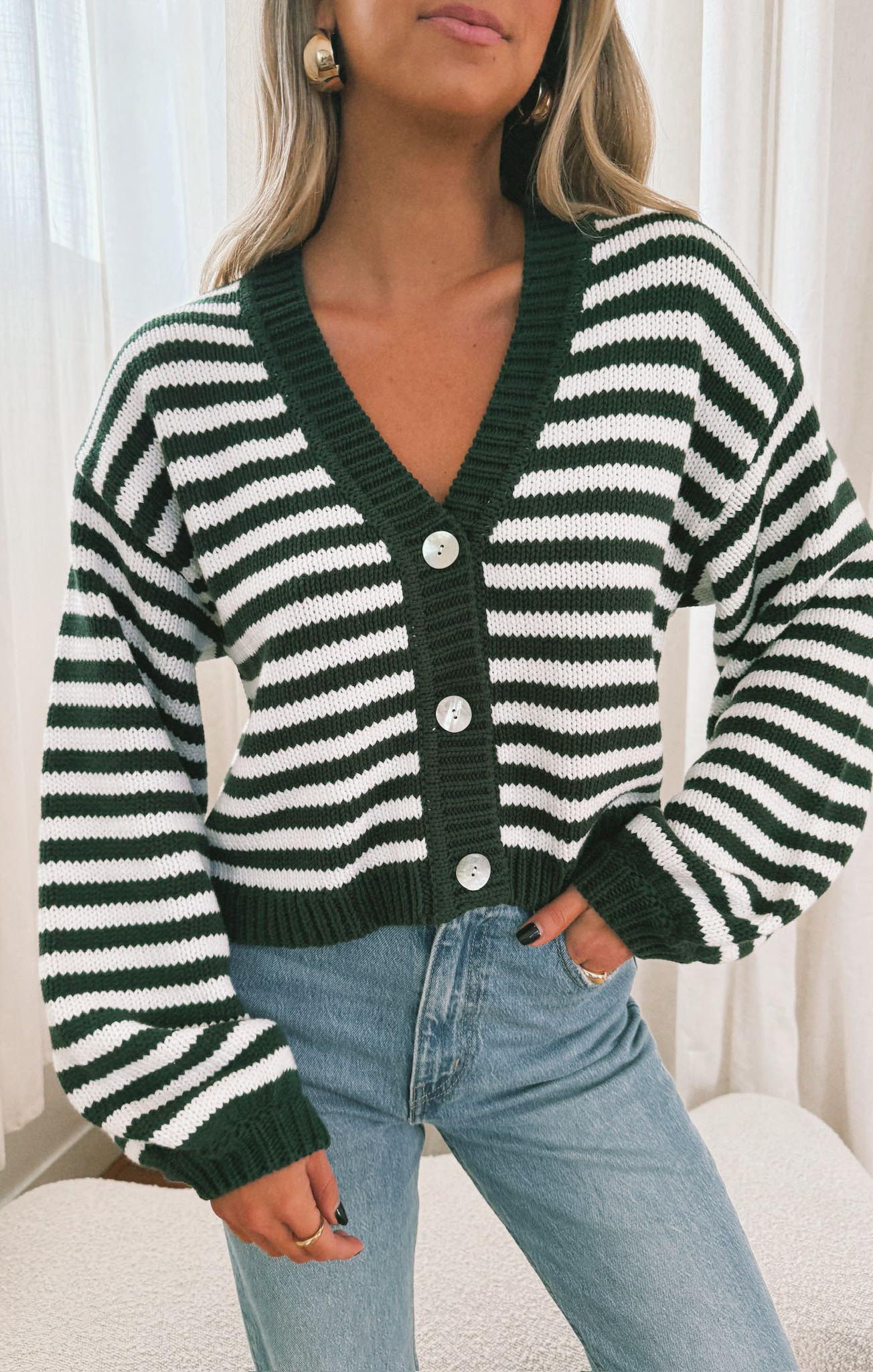 A cute, forest green knit card that adds a touch of positivity to any outfit. With large bubble sleeves, dropped shoulders, and a classic v-neck cut, it pairs beautifully with tanks and tees. The card features a cropped design and is perfect for adding a smile to your look.