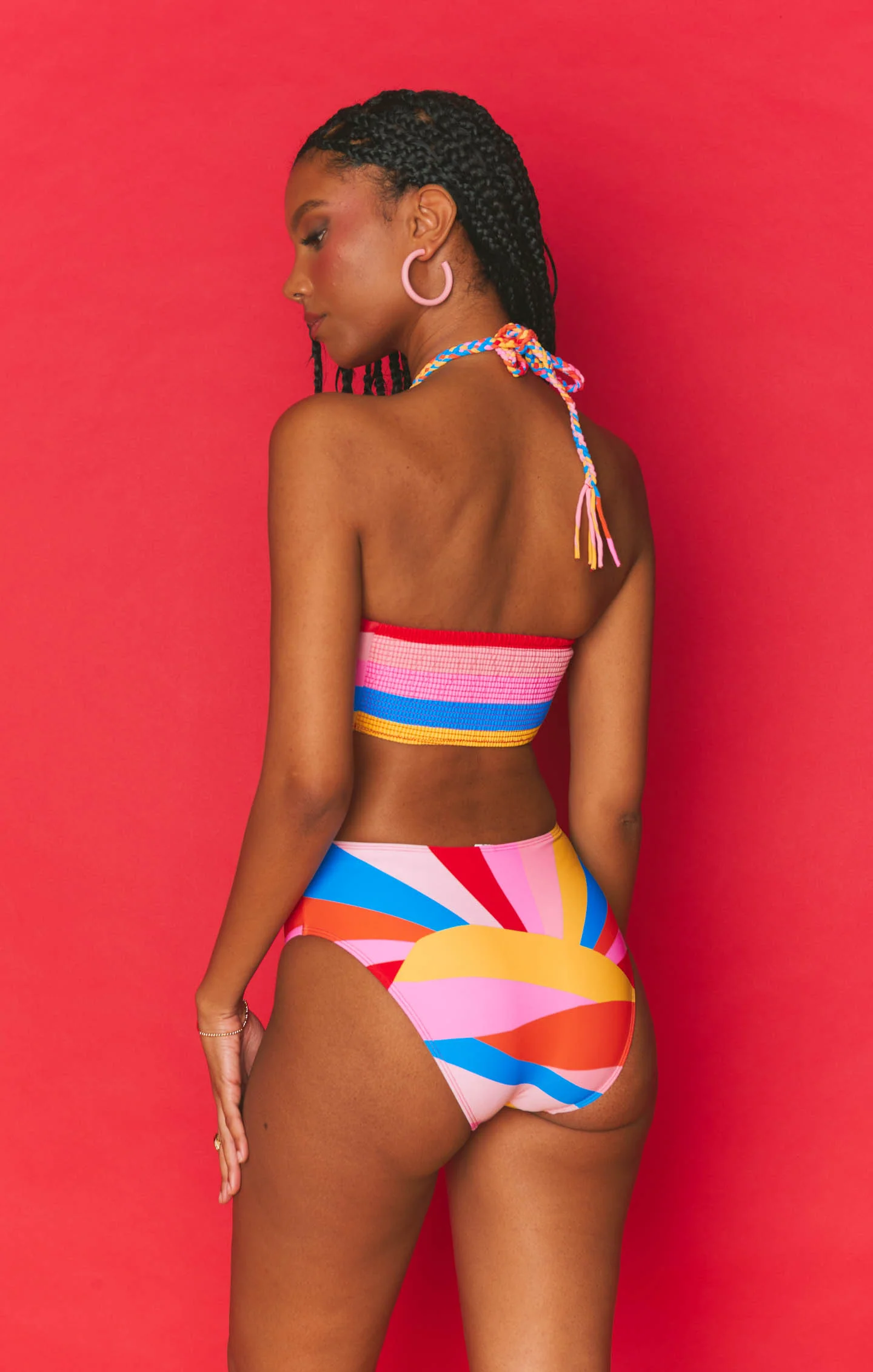 A cutest bikini designed for beach outings. It features a braided tie and smocked back, perfect for a stylish and comfortable look. The beach-ready Palma Bottom complements the design.