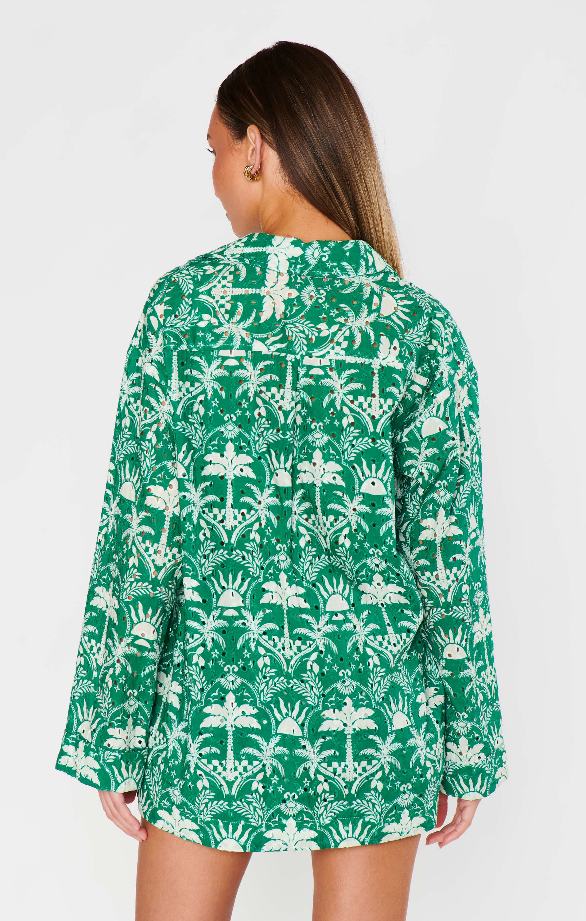 DetailA relaxed, oversized buttoned-up or tossed-on item for warm weather. Made from breathable, eyelet fabric, it's perfect for your next beach getaway. Pair with matching styles to create a coordinated beach look.