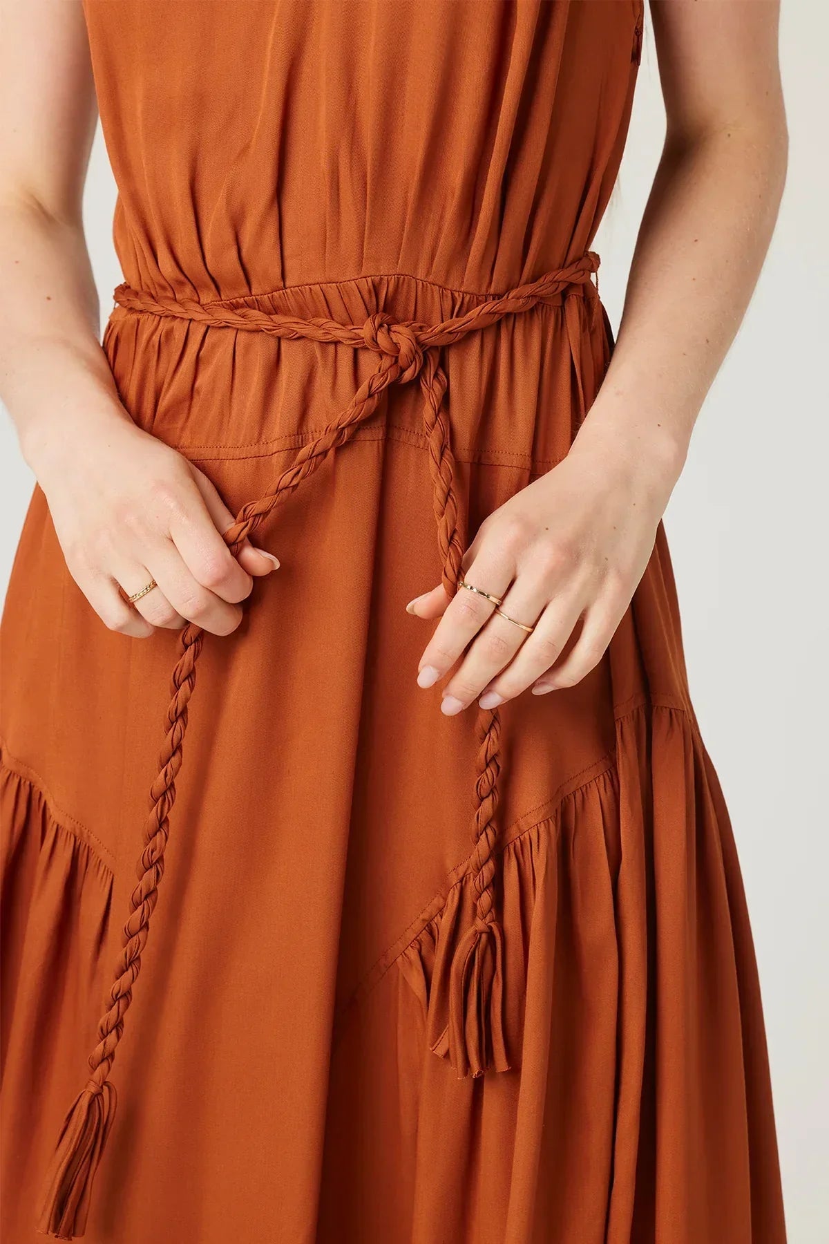 The Aura Dress is a versatile midi dress that exudes effortless elegance. Its unique twisted straps and rope belt add a touch of modernity to its classic silhouette.