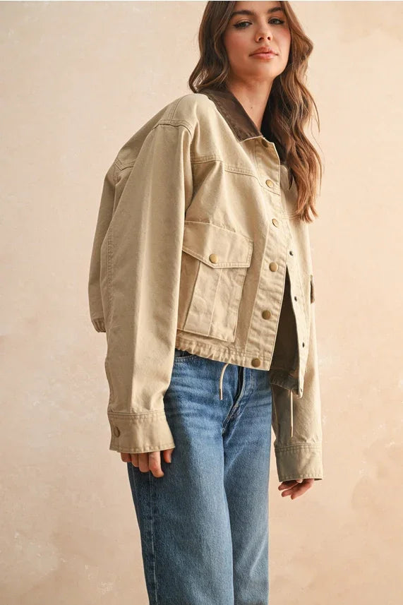 Designed with a striking contrasted collar, this piece adds a touch of sophistication to its rugged utility-inspired look. Whether you're heading out for a casual day or layering up for an adventure, this jacket ensures you stay effortlessly stylish.