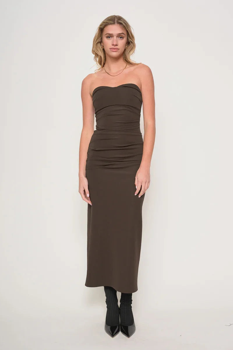 Turn heads effortlessly with the Lavene Strapless Maxi Dress, an epitome of sophistication and versatility. Cut from a luxurious brown fabric, this chic maxi silhouette features a flattering sweetheart neckline and smocked side panels that hug your curves for a tailored yet comfortable fit.
