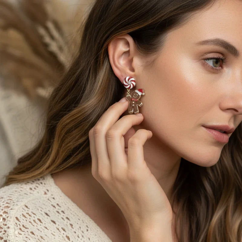 Add a sprinkle of holiday magic to your look with these utterly charming Gingerbread Man and Peppermint Dangle Earrings. Perfect for celebrating the most wonderful time of the year, these earrings are a sweet treat for your jewelry collection.