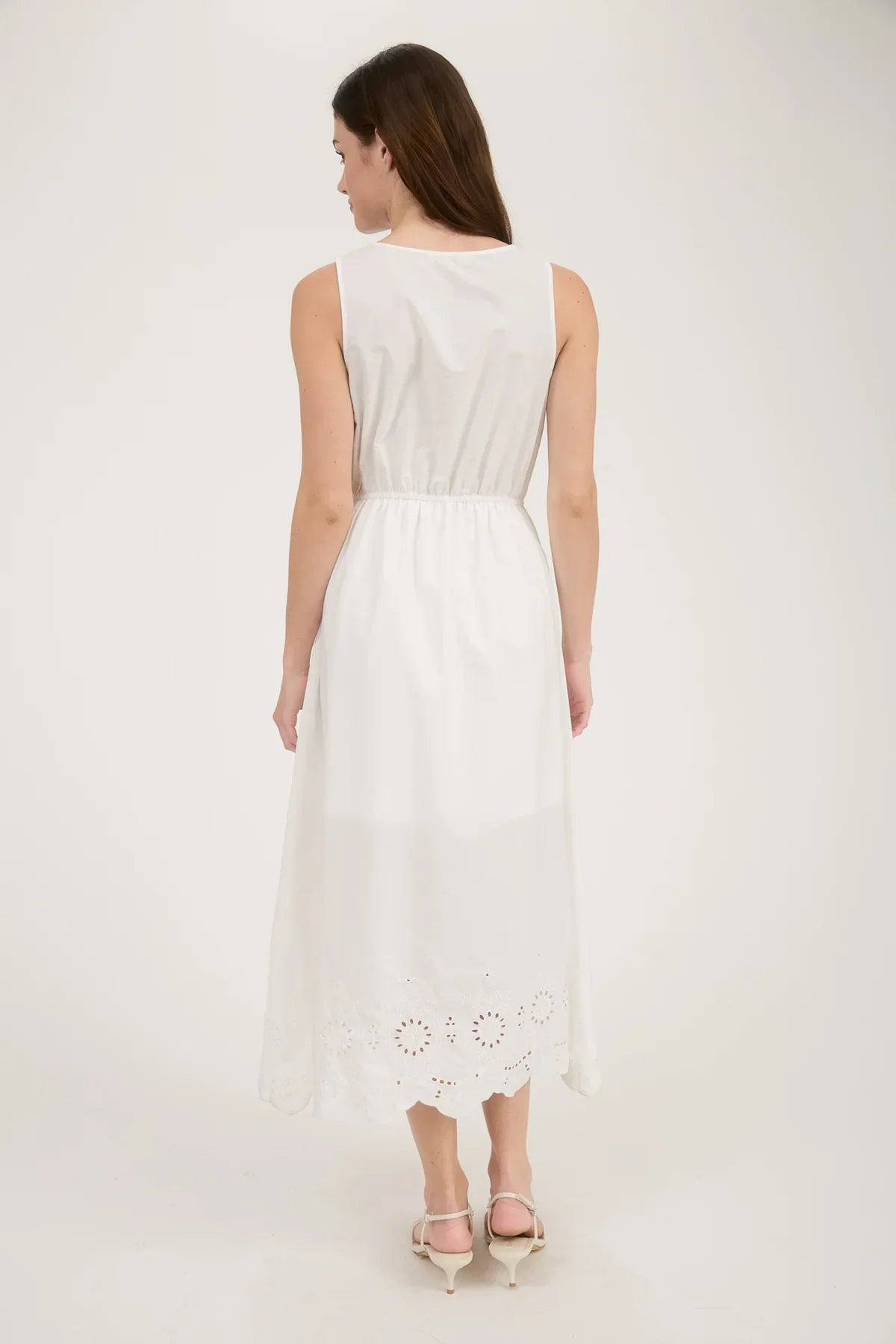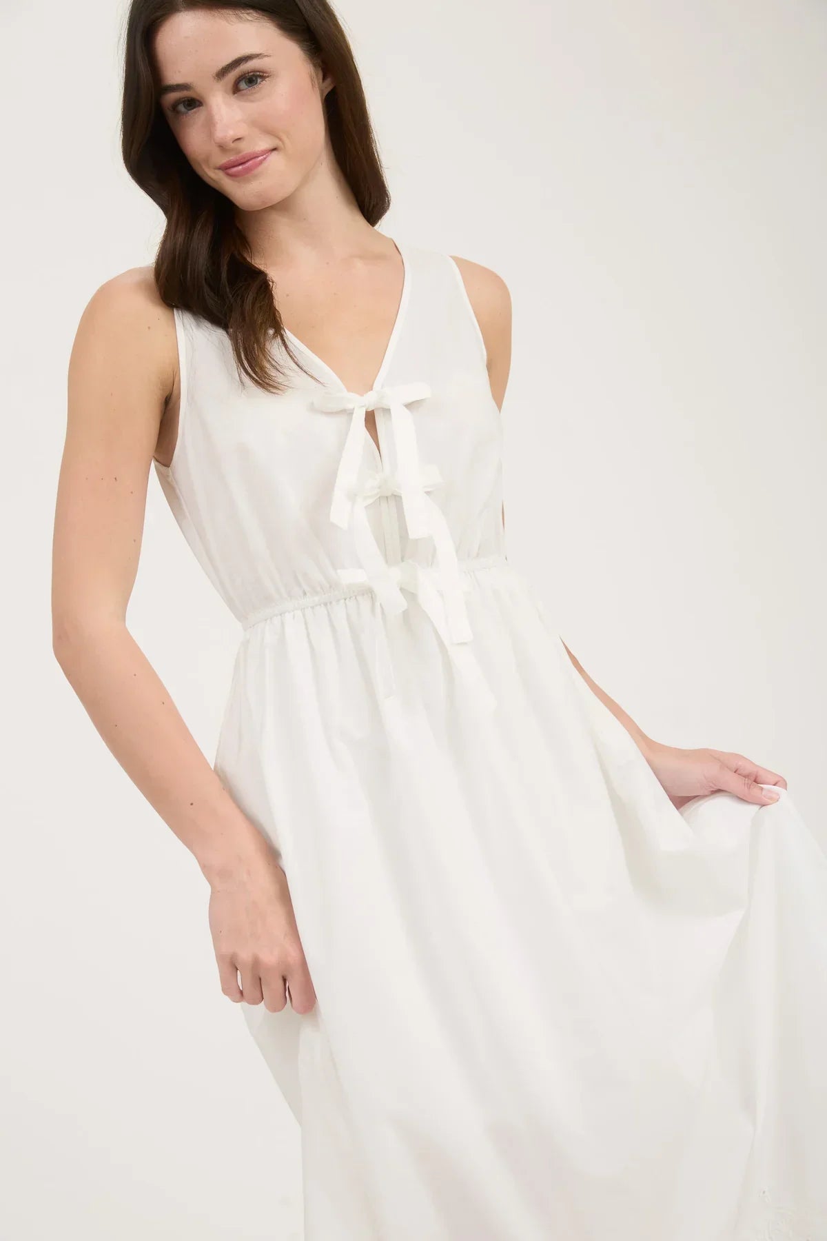 This charming midi dress from Daisy Lane features a flattering v-neckline adorned with a feminine bow tie. The sleeveless design and eyelet hem create a breezy summer look, while the elastic waist ensures comfort. Fully lined for a smooth fit, this versatile dress effortlessly combines style and ease for various occasions.