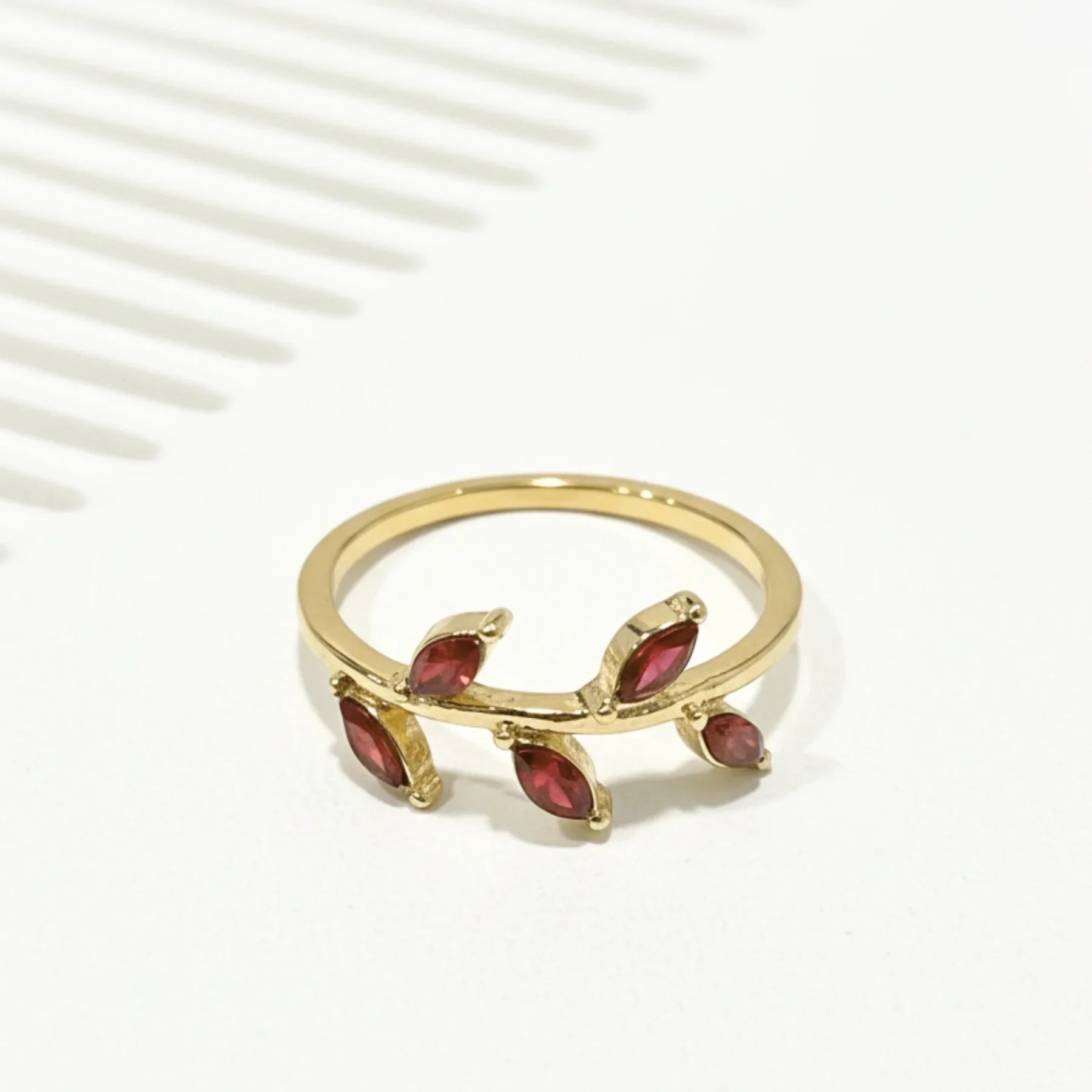 Embrace your free-spirited essence with our enchanting Gold Emerald Leaf Vine Ring, a truly nature-inspired piece designed to captivate. This delicate gold ring features a whimsical vine motif adorned with five sparkling emerald-like green or red stones, meticulously crafted to resemble verdant leaves.