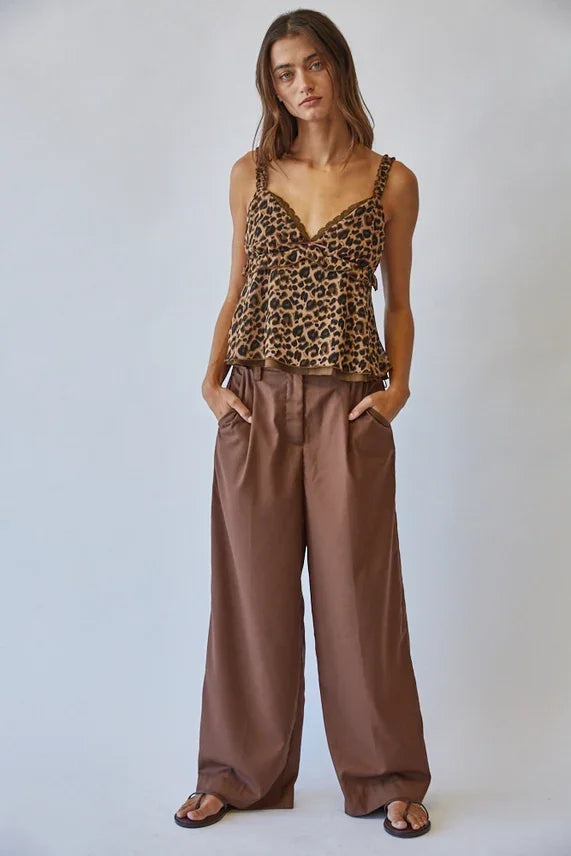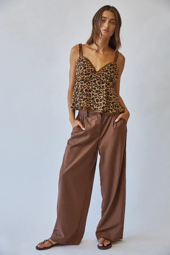 Crafted from lightweight woven fabric with a subtle sheen, this top is as comfortable as it is chic. Whether you're heading out for drinks with friends or styling it for a casual brunch, the Leopard Lace Ruffle Cami Tank Top is a must-have addition to your wardrobe.