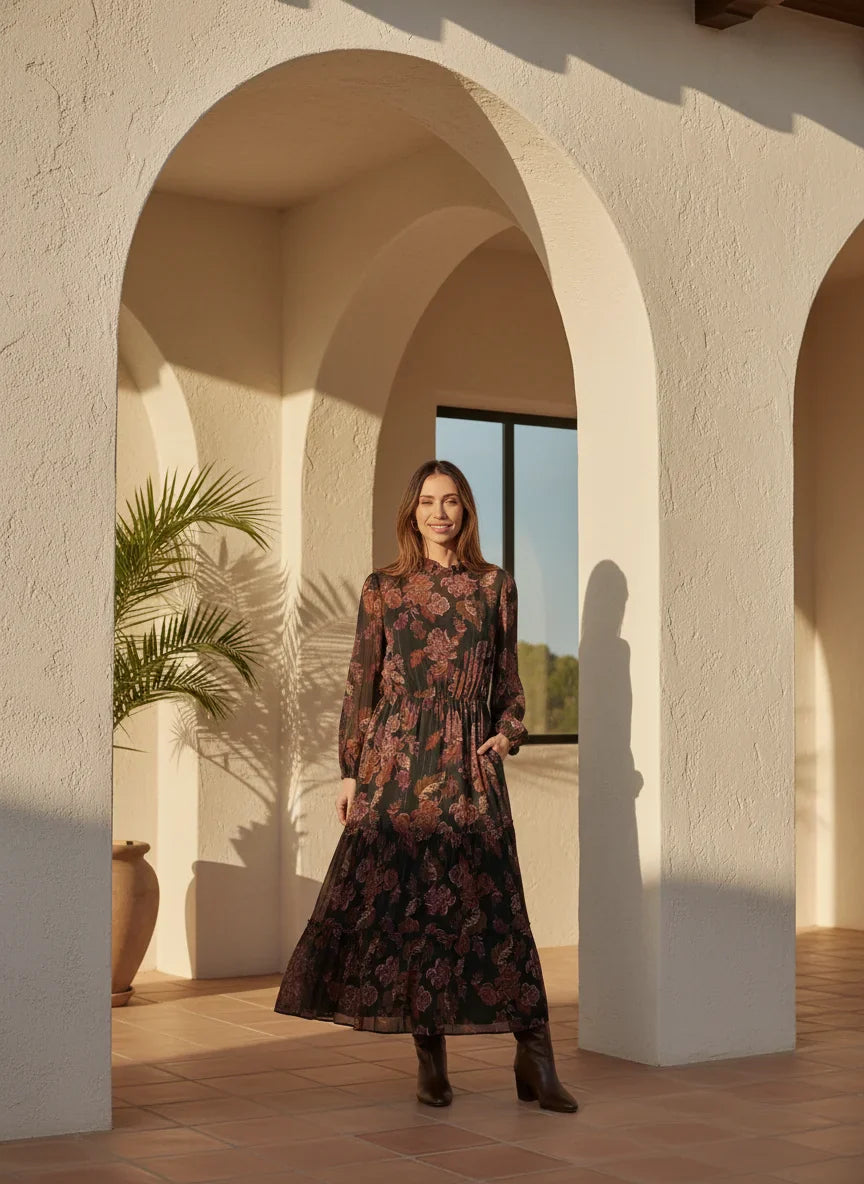Step into the season with grace and sophistication—make the Whispers Of Bohemia Maxi Dress your go-to fall favorite today!