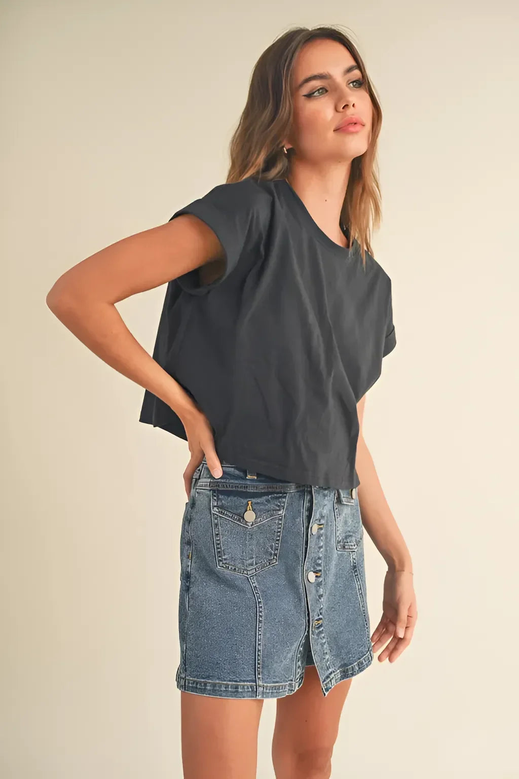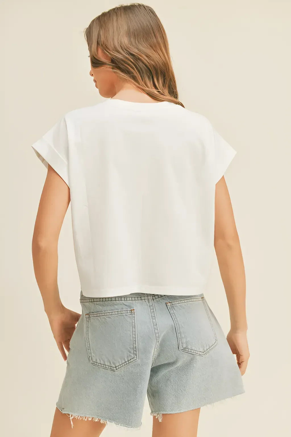Crafted from 100% premium cotton, it offers a soft, airy feel that keeps you cool and stylish, no matter the season. The cuffed sleeves and round neckline add a touch of modern simplicity, making it perfect for pairing with your favorite denim, skirts, or layered looks.