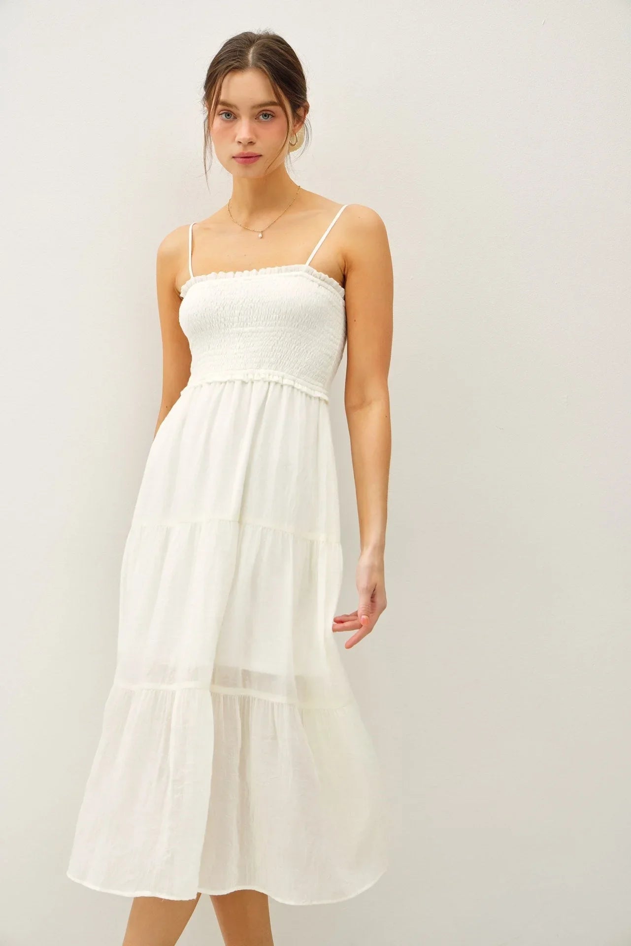 Elevate your wardrobe with the effortlessly chic Sheer Smocked Bodice Midi Dress. Designed for comfort and style, this dress features a smocked bodice that hugs your curves beautifully, while the tiered sheer skirt adds a touch of breezy elegance. The adjustable spaghetti straps ensure a tailored fit, making it perfect for any occasion.
