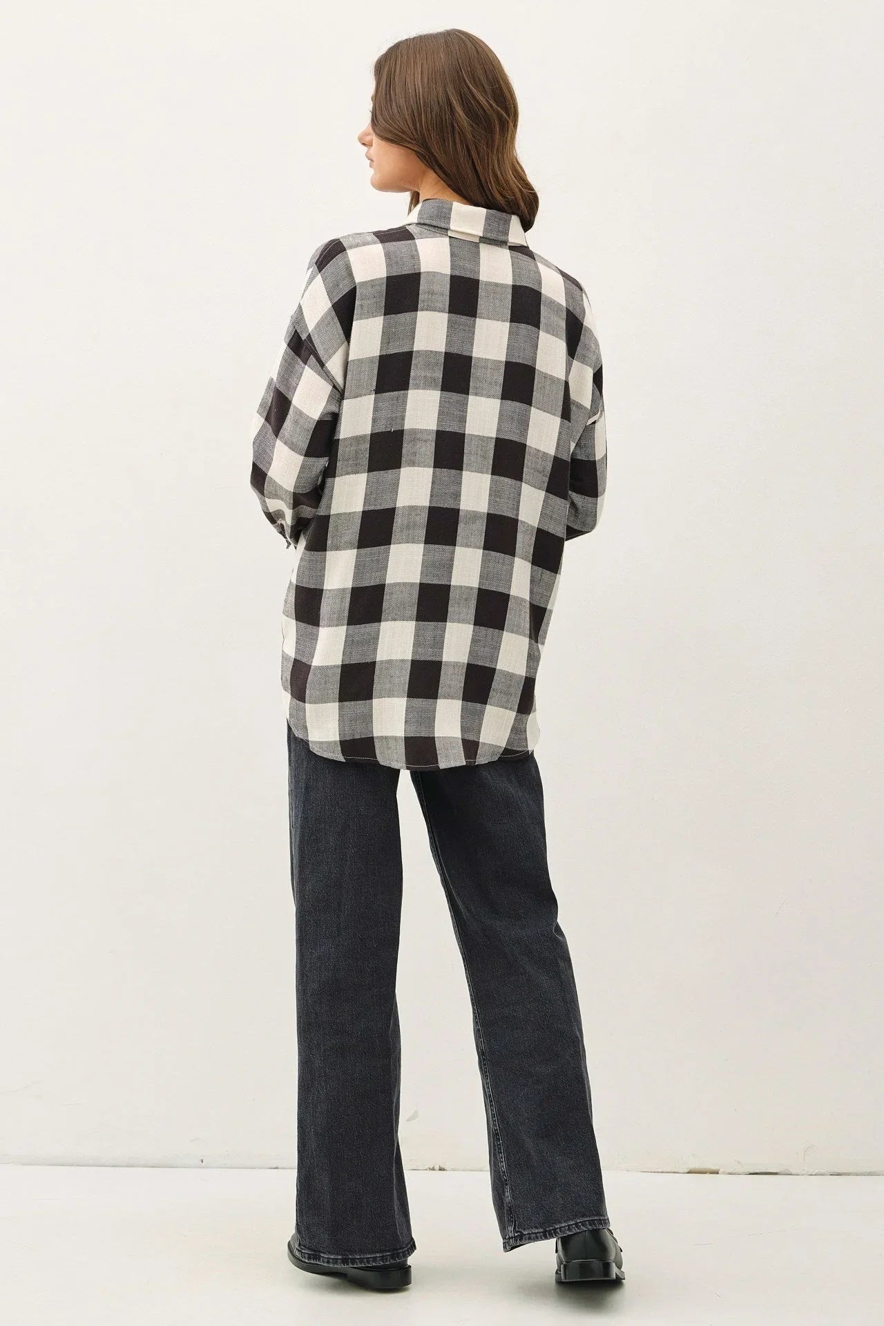This flannel shirt is your go-to piece for fall, winter, and autumn outings. Whether you're heading to a pumpkin patch, cozying up by the fire, or running errands, its checkerboard pattern and relaxed silhouette make it effortlessly chic and comfortable.