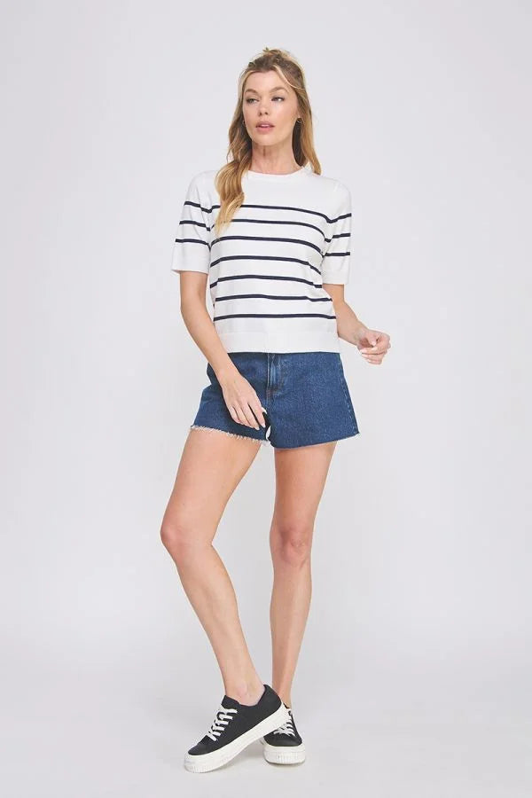 SOFT FINE SHORT SLEEVE STRIPED SWEATER TOP