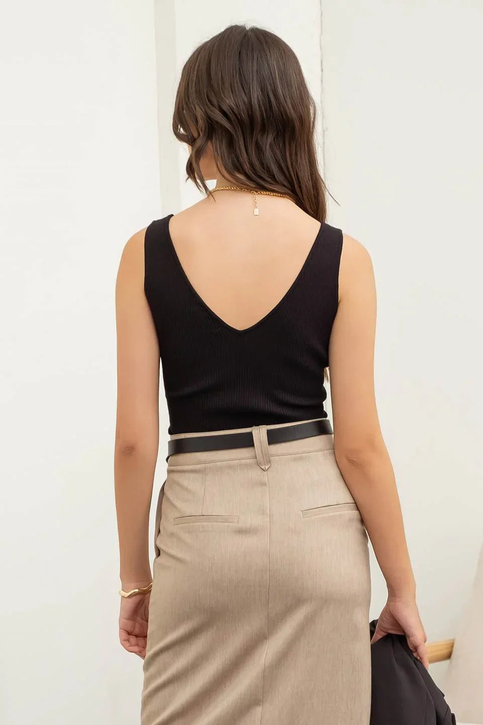 v neckline sleeveless fitted ribbed tank top solid